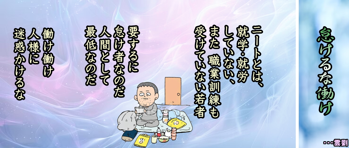 ニートをやめられずに続けていても、意地も張りもなくゴキブリの生活のように汚くよどんでいる。ただもうやめる気力も能力も失っているわけだ。こういうのを自業自得という。こういうこともありの社会が自由な社会である。少しも異常な社会ではないのだ。