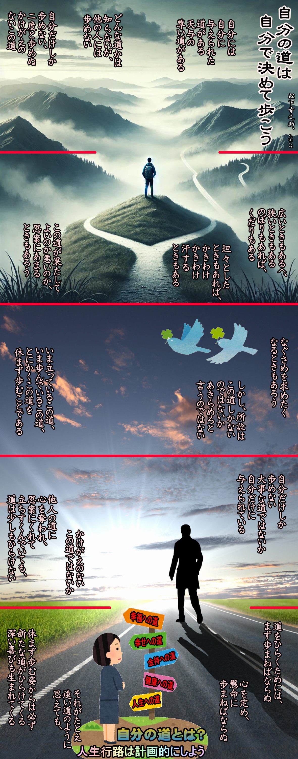 ◆2、老春、第二の人生へ ・・・エレノア・ルーズベルト ◆自分にはできないかも知れないという恐れに真正面から 立ち向かうたびに、あなたは強さと自信と経験を勝ち取るのです、 だから、できないと思うことに挑戦してごらんなさい ・・・美輪明宏 ◆どんなトラブルが起きても微動だにしない そんなレベルに達するまで人生の修行は続きます 弱音を吐かず覚悟を決めて過ごそう ◆自分の道は自分で決めて歩こう