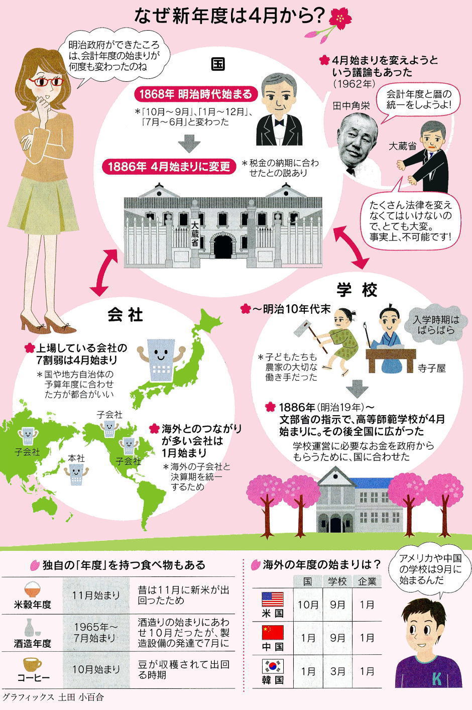 *財政法 国の予算を作る時やお金を使う時の決まりを定める法律。国のお金のやりくりを考える基本になる。 *会計基準 会社のもうけや財産などの状況を表すルール。株主や投資家が企業と企業を比べやすくする。 *「早生まれ」にも影響 豊島岡女子学園中学高等学校の神谷正昌先生の話 元プロ野球選手の桑田真澄氏は高校1年の夏から甲子園に出ました。4月1日生まれで、当時、出場中最も若い選手としても話題でした。4月1日生まれは「早生まれ」に含まれ、小学校には満6歳になった4月1日に入学できます。学校教育法では、満6歳になって初めて迎える4月1日に入学することになっているのですが、民法上、年をとるのは誕生日前日の深夜12時。つまり3月31日の深夜12時に満6歳になるからです。早生まれは、就学年度が4月1日始まりのため生じます。では年度が1月始まりの時代はどうだったのでしょうか。日本では、明治半ばに満年齢で一本化される前は「数え年」を使っていました。生まれた年を1歳とし、正月を迎えるごとに年齢を重ねるというもので、皆が一斉に年をとっていたのでわかりやすかったようです。