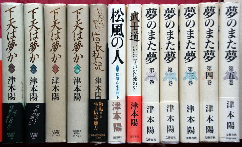 また津本氏は、資料の扱いにも定評があったが「下天は夢か」では「武功夜話」等、膨大な資料を総動員。小説の中でも、自分なりの解説を加えながら作品を進めるのが常で、文体は重厚、簡潔なものであった。この後、豊臣秀吉を措いた「夢のまた夢」 (茜川英治文学質)、徳川家康を描いた「乾恥の夢」の夢三部作?等を執筆。が、故郷和歌山への思い断ちがたく、火縄銃を駆使して、戦国期に活躍した紀伊の豪族、雑賀一族を描いた「雑撃六字の城」等を発表した。