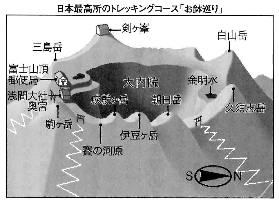 3776メートルを登りきって頂上に到着すると、大きな満足感が得られ、しばらく感動に浸りきってしまう。そのため意外と知られていないのだが、富士山頂には魅力的なトレッキングコースが存在している。「お鉢巡り」と呼ばれる日本最高所のコースだ。富士山頂には、最高点の剣ケ峯をはじめとして、自山岳、久須恵岳、朝日岳、伊豆ケ岳、成就ケ岳(じょうじゅがたけ)、駒ヶ岳、三島岳の8つの峰が連なり、大内院と呼ばれる噴火口を取り囲んでいる。