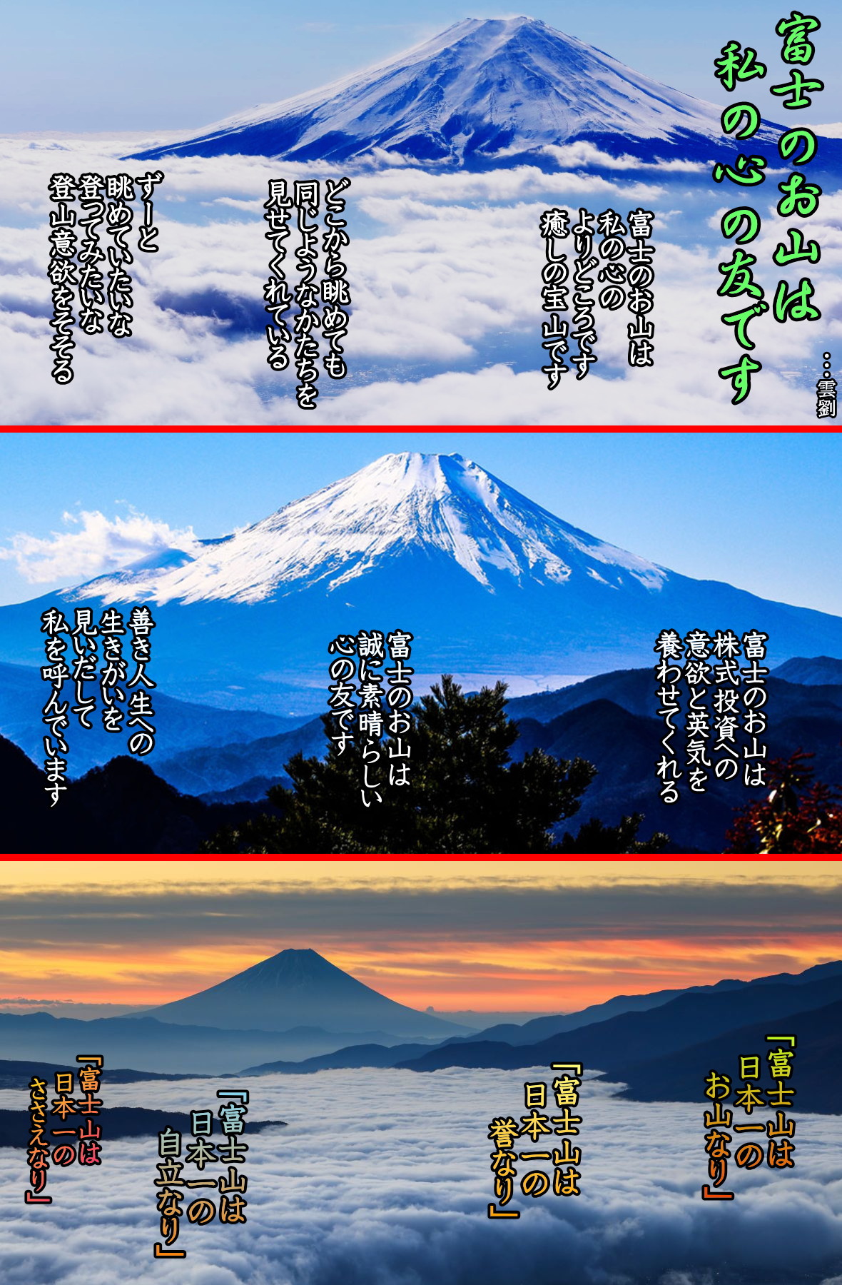 日の本一の高さを誇る素晴らしき富士山(標高3,776m)は、その壮大さと、昔から頻繁に繰り返された荒々しい噴火によって、古来より人々の畏敬(いけい)を集め、「信仰の対象」となってきた。またその円錐形をした美しい姿は、多くの芸術家に刺激を与え、数多くの「芸術の源泉」となっている。
