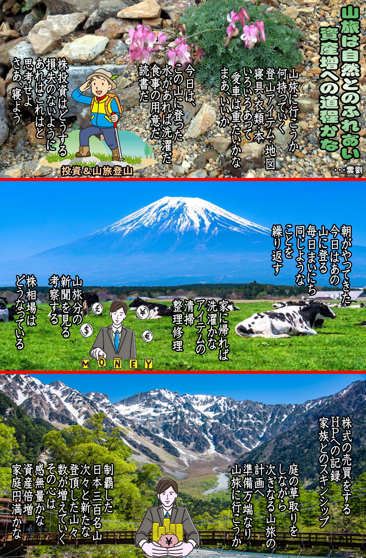 子供の頃から藪山に山菜と秋の恵みを追いかけて駆け回った。仲間とはぐれたりして別々に家に帰ったりして、次第に藪山の感覚を身につけていった。本格的に山に登りだしてから、道なき山に登った時は子供の頃の経験が役に立っていた。 藪山の危険さを熟知して全神経を集中させて藪漕ぎして山の頂きに立てば、真の山の素晴らしさが心の中にいつまでも息づいている。