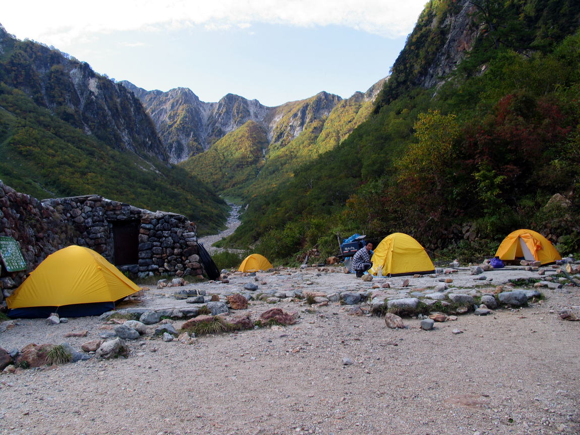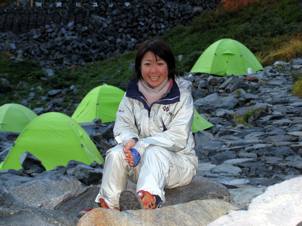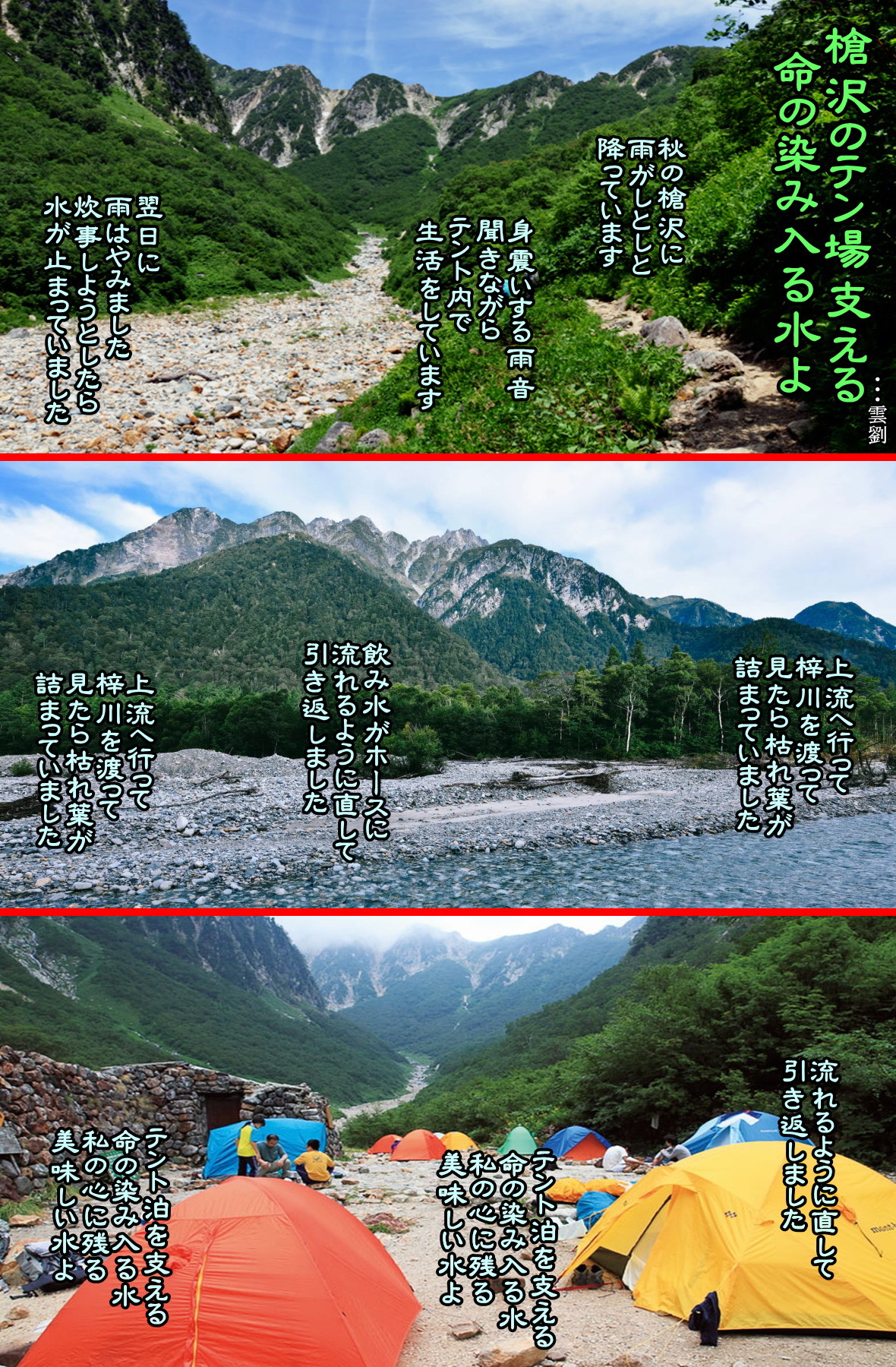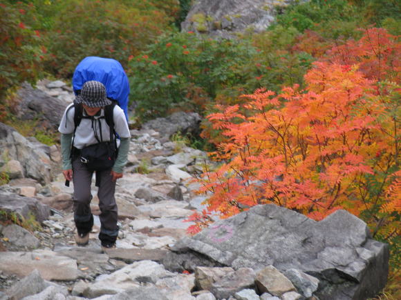 2005-10-** ◆女性三人組と涸沢へ、南稜〜北穂高岳〜奥穂高岳〜涸沢へ 槍沢テン場にテントを張り翌日は雨降りだった。次の日の朝になったら水が出なくなっていたので、川を渡って水取り入れ口のホースがゴミで詰まっていたので取り除いた。テン場に帰って確認したらホースから水が流れていた。彼女たちも朝に水が出ていなかったので困っていたところだったが出てきたのでホッとしていたと話された。朝食を済ませて御一緒に横尾へとお話をさせていただきながら歩いた。