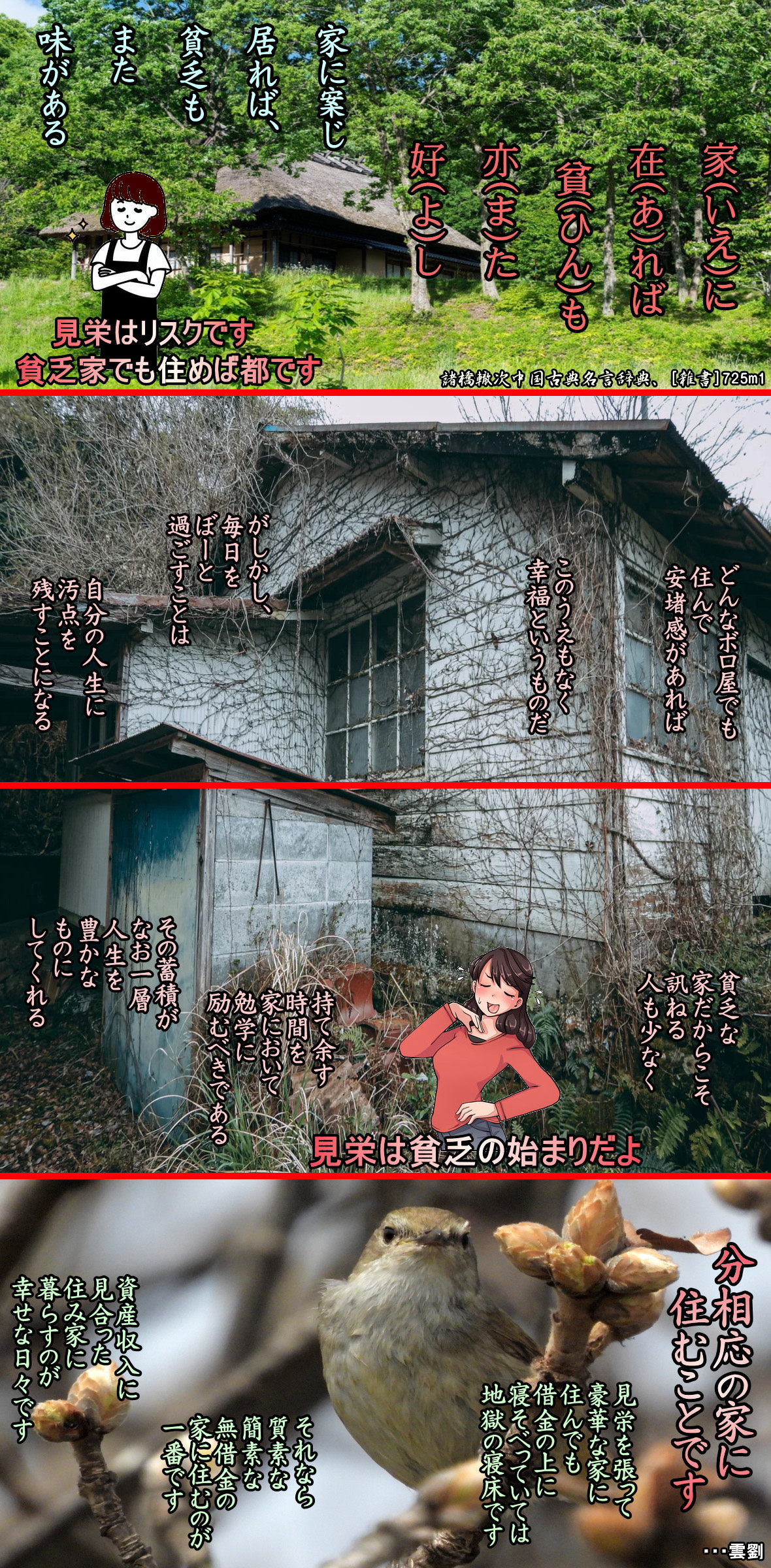 ただ、金ができたからすぐに大きな家を、という発想は、いかにも短絡的かつ場当たり的ではないのか。あまりにも陳腐な考え方であるので、安っぽいという印象を与えざるをえない。