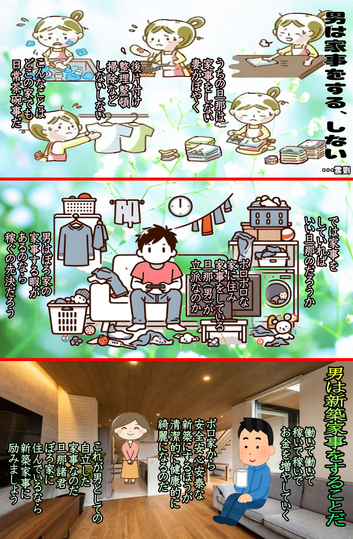 ・・・荻原博子著「定年前後の「お金」の裏ワザ」より ◆退職金で家を買ってはいけません *退職後、ずっとそこに住み続けのですか *自分より先に家が老朽化しないか *老後資金が足りなくならないか *退職金は老後への大切な資金です 人生百年時代に生きるための資金なのです 年金も百年に向かっての生活するための資金なのです ・・・本田健 「幸せな小金持ちとじっくり話してみると、彼らが明確な人生の哲学を持っていることがわかります。」 ◆男は家事する・しない