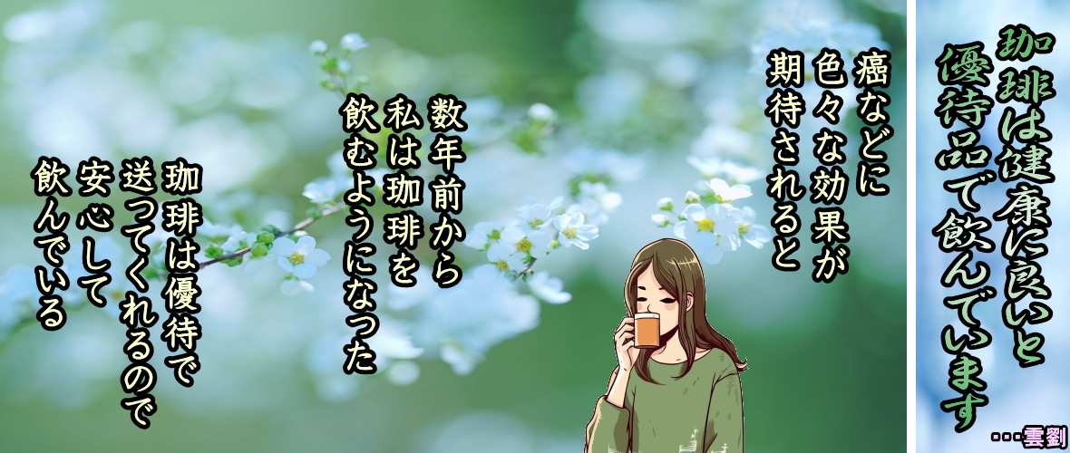 ・・・・・・・・・・・・・・・・・・・・・・・・・・・・・・・・・・・・・・・・・・・・・・・・・・・・・・・・・・・ ・・・雲劉 *値段の高い有機珈琲を飲もう 若いころにコーヒーを飲むと時々下痢をしていた。ゆえにコーヒーは飲まなかったが、ある時に高い珈琲を飲んだが下痢はしなかった。安いコーヒーは不健康な不純物(薬物)が含まれているのだろう。 ・・・ホームライフ取材班編「日本人の九割がやっている、残念な健康習慣」より ◆深煎りコーヒーを飲んで、ポリフェノールで若返り? ポリフェノール豊富なのは浅煎り−、深煎りにはほとんどなし コーヒーは近年、ポリフェノール豊富な飲み物であることが知られてきた。その高い抗酸化作用はアンチエイジングに有効だと、毎日、健康づくりのためにコーヒーを飲んでいる人もいるだろう。しかし、その愛飲するコーヒーが深煎りなら、望むような健康効果は得られない。コーヒー豆に含まれるポリフェノールの主成分、クロロゲン酸は熱に弱い。 長く焙煎するほど減っていくので、深煎りにはほとんど含まれていないからだ。その一方で、長く焙煎すると、血栓防止やリラックス効果のある成分が増えていく。このため、一概に浅煎りがよく、深煎りが悪いともいえない。ただ、アンチエイジング効果を求めるのなら、浅煎りに限るのは確かだ。