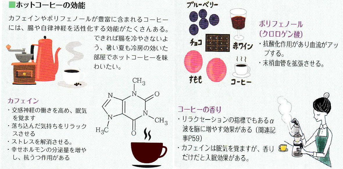 ・・・「自律神経にいいこと」、監修・青山由美子、編著・赤池広行44 ◆心身の不調をリカバリーしてくれる一杯の温かいコーヒー ■血流アップや抗うつ効果も得られる コーヒーの温もりは腸の冷えを改善し、心身の不調をリカバリーしてくれる。コーヒーや紅茶などに含まれるカフェインは、交感神経の働きを活発にし、眠気をとり、ストレスを解消して疲れや落ち込んだ気持ちを癒やしてくれる力がある。 コーヒーの効能はカフエインだけではない。まだ確定したデータではないが、コーヒーは脳卒中、心筋梗塞にも良いのではないかという研究も進んでいる。コーヒーに含まれるクロロゲン酸というポリフェノールの抗酸化作用が関係しているようだ。末梢血管を拡張する作用があって、血流を良くしてくれるということ。 このクロロゲン酸は焙煎の浅いコーヒーのほうが多いこともわかっていて、カフエインレスのコーヒーでも効果がありそうだ。そのほかコーヒーは、大腸のぜん動活動を刺激するので便秘解消、腸内環境の改善にも一役買ってくれる。さらにハーバード大学の研究では、コーヒーには腸壁でつくられるセロトニン、ドーパミンといった「幸せホルモン」の分泌量を増やす「抗うつ効果」があり、愛飲者にはうつ病患者が少ないこともわかった。 この研究では、コーヒーを1日2〜4杯飲む成人男女は自殺リスクが半減するそうだ。また国内の大規模な疫学調査による「コーヒーで糖尿病の発症率が下がる」という報告にも注目したい。