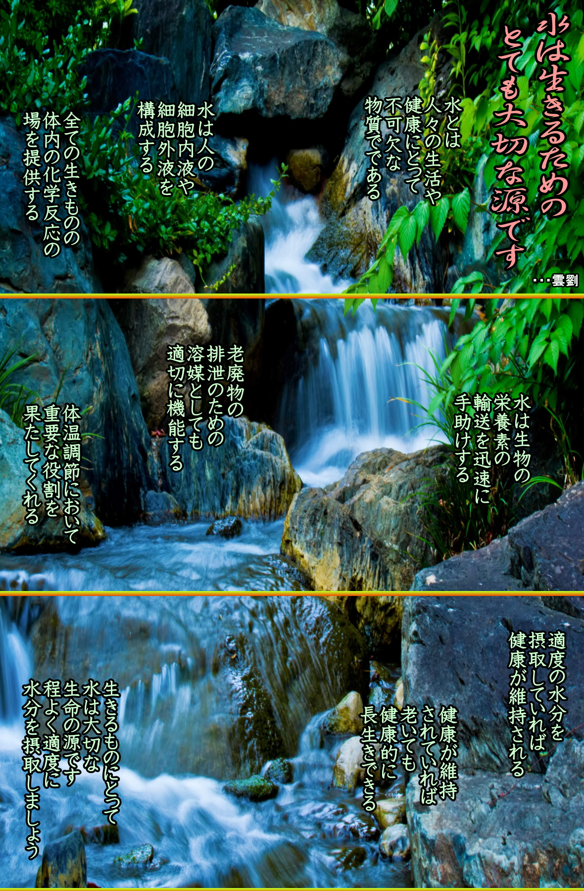・・・板倉広重監修「ここが知りたいコレステロールを下げる新常識」より ◆水を上手にとりドロドロ血液にさようなら 私たちの体の約70%は水分でできています。この水分は、汗・尿・呼吸などで失われるので、体の各機能を維持するためには常に水分を補給することが必要です。とくに、高コレステロールの人は余分な脂質で血液の流れが悪くなり、血管内壁も狭くなっています。 体内の水分が不足すると、血液の濃度がいっそう高まってドロドロになるため、血栓ができやすくなり、心筋梗塞や脳梗塞のリスクが高まります。しかし、喉が渇くといった自覚症状は、脱水症状が進まないと出てきません。 そのため、私たちの体は水分不足におちいりがちです。人は1日に、体重×約50mlの水分をとる必要があります。体重65kgの人であれば、1日に31mlの水分が必要です。食事で約11、細胞代謝で200〜300ml補給できるので、残りの21を飲み物からとるようにします。 食後のお茶などで500mlをとるとして、そのほかに1・5リットルくらいの水を数回に分けて飲むといいでしょう。新陳代謝が活発になり、老廃物の排出も促され、血液の濃縮度が緩和されてサラサラになります。 ノンカロリーの飲み物はいろいろありますが、水分補給にいちばんいいのは、水そのもの。最近はいろいろなタイプの水がボトルで手に入るので、飲み比べてみるのも楽しいでしょう。 ●水の上手なとり方 ・1日1.5リットルの水を7−8回に分けて飲む。1回200mlが目安。 ・ゴクゴク飲まず、ひと□ずつ噛むように、ゆっくりと飲む。 ・水は冷やしすぎず、常温ぐらいが最適。 ・水を飲む効果的な時間帯は、起床時、食事の前、運動と入浴の前後、就寝前。 |
