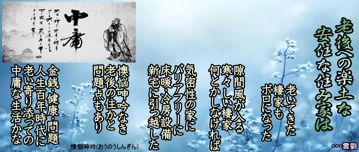 ・・・雲劉 ◆程々の快適な住み家でないと年金生活が危ぶまれてきます ・・・・・・・・・・・・・・・・・・・・・・・・・・・・・・・・・・・・・・・・・・・・・・・・・・・・・・・・・・・ ●持ち家でも老後は安泰ではありません 年金額がある程度確保されていても快適な住み家がなければ快適な年金生活を貧困へと落ちぶれた老後人生になってしまいます。30代前後で自分の家を建てて住んでいても65歳になれば築35年が過ぎ去ってしまいます。家はあちらこちらが傷んできます。修繕費が老後に重くのしかかって年金を脅かしてきます。 ではどうすればいいのだろうか?。この問題は私でさえも難問なのです。私の場合は最初の住み家は28歳の時に20年ローンで平屋の新築の家を建てました。60歳の頃に2度目の現金で宅地を買って新築の家を建てました。これで安泰かなと思っていましたが、今の時代は「人生百年時代」です。私が百歳も生きていたら60歳で建てた家は築40年になってしまいます。 またまた修繕費が重くのしかかってきます。しかし、私が90歳を過ぎれば脳も足腰も弱ってそれどころではなくなっていることでしょう。そうなれば今住んでいる持ち家にいられなくなって老人ホームや介護施設へと行かされるのではないだろうか。若い頃から何のために働いて稼ぎ生活してきたのだろうか?。 これが健康に気を使って質素倹約しつつ住み家の為に多額のお金の浪費してくるのが私という人間の生涯をかけた人生なのだろうか?。年金が安い、年金が足りない、年金をかけていなかった、年金が貰えない、老後準備金がない。年金が多い少ない、お金がある無しに関わらず、どんな理屈をこねても、生きている限りどこかの家の中で、軒下などで住んで暮らしていかなければならない宿命なのです。