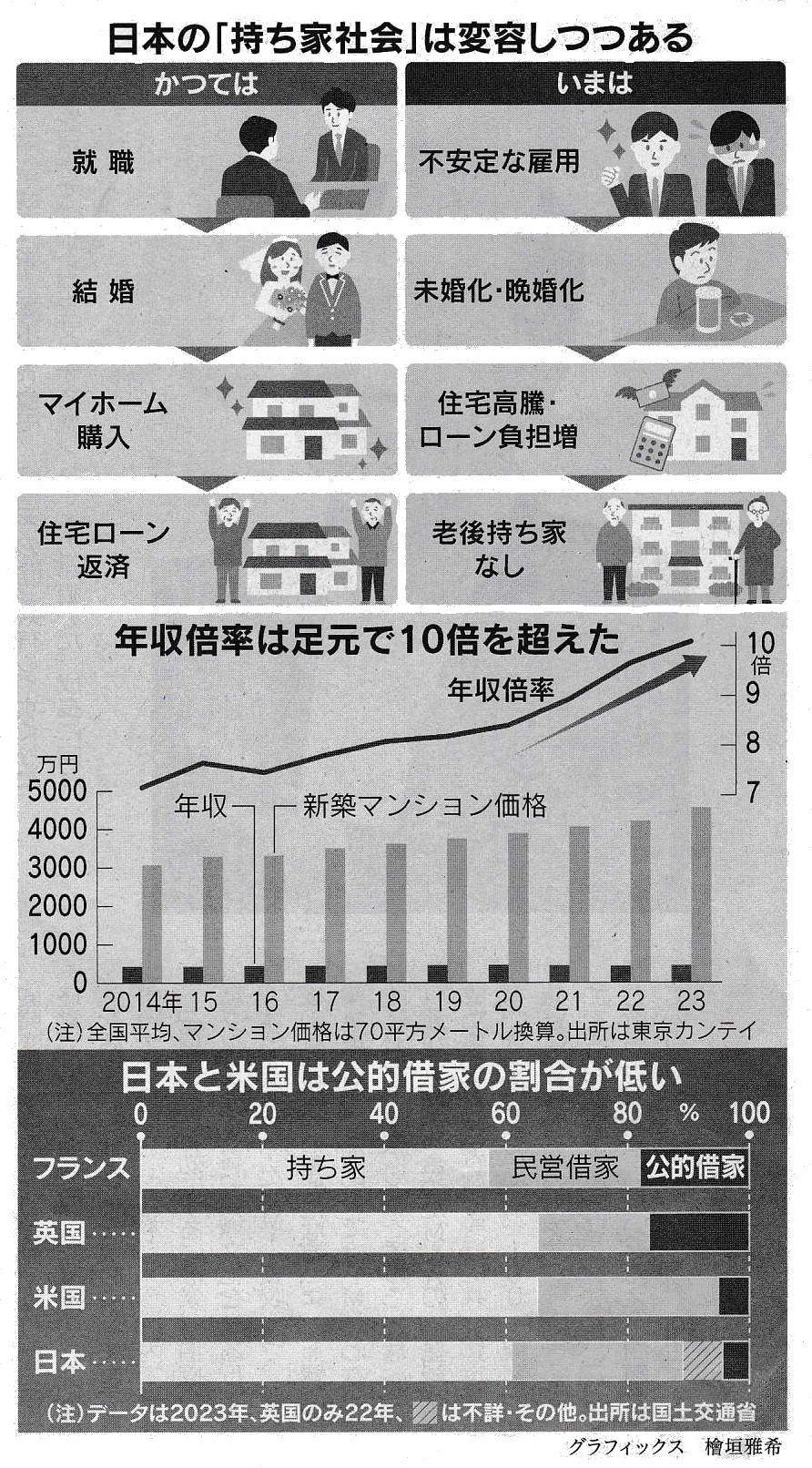 ●賃金低迷・単身増…購入者の条件瓦解 ただ、社会は変化し、購入者の条件は瓦解している。経済の停滞などで雇用は不安定になり、未婚化や晩婚化で単身世帯が増えた。結婚したらマイホームを買うというストーリーが崩れ、新築住宅の着工戸数は年間約80万戸と最盛期の半分以下となった。住宅政策に詳しい摂南大学の平山洋介特任教授は「今は中間層でさえ家を買えない社会になってしまった」と語る。 より多くの人が恩恵を受けられる政策への変更が迫られているのは確かだ。日本と同様、住宅が高騰し、 一般の人の手に届きにくい国の一つが英国だ。「UBSグローバル不動産指数」の24年版によると、ロンドンの住宅の年収倍率は12倍で、東京( 14倍)やパリ( 13倍)に次ぐ高い水準にある。英国政府が注力するのは、手ごろな金額の「アフオーダブル住宅」を官民連携で供給する仕組みだ。 開発業者への支援や規制を駆使し、売価や賃料を市場価格の80%程度に抑える。フランスはより直接的で、低所得世帯の約5割が政府から住宅手当を受けている。欧州には公営住宅が充実している国も多い。住宅総数に占める公営住宅の割合は、オランダが30%超と高く、英仏も10%を上回る。 公営住宅に国民の8割が住むシンガポールでは、公営住宅の売買も可能にしている。平山氏は「日本では親の持ち家がセーフティーネットの役割を果たしてきた」と話す。ただ、今後は家を持たない親も増える。持ち家でも賃貸でも、理想のマイホームをどう身近にするか。住宅施策の再建が求められている。 ◆中古・空き家に活用余地 新築優遇の持ち家政策に代わる選択肢として、有力なのはまず中古住宅の流通促進だ。総務省の住宅。土地統計調査によると、23年10月時点の総住宅数は6504万戸で、そのうち900万戸が空き家だった。空き家数はこの30年で倍増した。新築への偏重が続いた日本では、住宅投資に占めるリフォームの割合が低い。 平山氏は「中古住宅に手を入れて価値を維持すれば、流通量も増える。リフォームを政策として支援すれば、高い経済効果を生む」と指摘する。手ごろな家賃で住めるアフォーダブル住宅の供給も候補となる。東京都は制度が充実するニューヨークやロンドンを参考に検討を進めている。民間と連携して総額200億円規模のファンドを立ち上げ、子育て世帯などに市場価格より安く住宅を提供する計画だ。空き家の活用も想定している。 「都の政策だけでは供給規模が少なく、市場に与えるインパクトは小さい」という意見もある「ただ、都は容積率など建築基準の規制緩和を通じてアフォーダブル住宅の供給を誘導する手法を模索しており、国や他の自治体にとって参考となる点は多い。 国や自治体の財政が厳しいなかで、新たな公営住宅の建設や一旦支給すると打ち切りが難しい家賃補助の導入はハードルが高い。中古住宅や空き家など投資してきたストックを有効活用できれば、新築・持ち家の一本足打法から脱却も、多様な選択肢を示すことにっながりそうだ。 (安部大至)