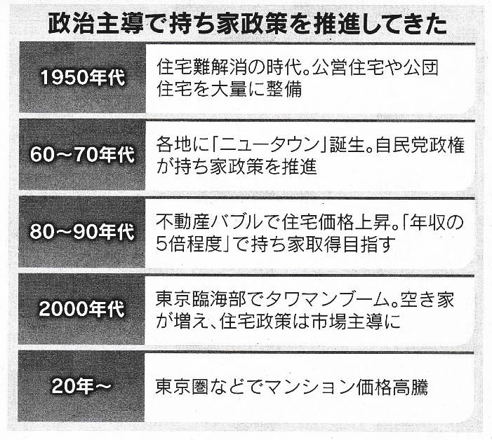 ■持ち家政策 新築住宅の購入を促す戦後日本の住宅政策。住宅取得を望む中間層への金融支援を中心的な手段とした。一般家庭の数年分の年収にあたる住宅購入を可能にするため、政府が住宅金融公庫を通じて長期。低金利の住宅ローン融資を行った。原武史・明治大学大学名誉教授は「1950〜60年代に建た団地には革新政党の支持層が多く住んでいた」と指摘する。 自民党政権には中間層を育成して保守政治の安定を図る狙いもあった。高度成長期以降は景気対策の側面が強まった。70〜80年代は住宅金融公庫、90年代以降は民間金融機関が中心となって住宅ローンの融資を拡大し、住宅需要を喚起した。税制面でも住宅ローン減税などで新築住宅の購入を優遇した。
