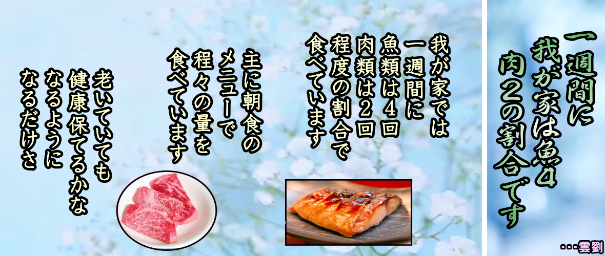 ◆12、食育・食活・食欲・食健 ・・・藤田紘一郎著「腸が寿命を決めている」より ◆1、腸内細菌の大好物、食物繊維をたっぷり摂ろう 食物繊維は今や「第六の栄養素」です 腸が大好きな食べ物は、善玉菌の働きを活発にしてくれたり、善玉菌の数を増やしてくれるものです。それは、野菜類や果物類に豊富に含まれている食物繊維であることは、先ほど触れましたが、ここで食物繊維と腸の関係について、もう少し詳しく説明しましょう。食物繊維は、かつては食べ物のカスとして、栄養学的にはあまり重要視されていませんでした。 しかし、実は善玉菌を増やしたり、食後の血糖値の上昇を緩やかにする、腸内の不要物を便として排出するなど、今ではその働きが見直され、たんぱく質、炭水化物、脂質の三大栄養素、それにビタミン、ミネラルを加えた五大栄養素に次ぐ、第六の栄養素となっています。腸内細菌の最大の好物であることを考えると、腸の健康にとっては第一の栄養素といえるでしょう。 食物繊維には水に溶ける「水溶性」と、水に溶けない 「不溶性」 のものがあります。水溶性の食物繊維は、ワカメや昆布などの海藻類、納豆、うずら豆などの豆類、ニンニク、ゴボウ、エシャロットなどの野菜類、アボカド、レモン、リンゴなどの果物類に豊富に含まれています。また、オクラやモロヘイヤ、サトイモなどのネバネバした食品にも含まれています。 一方、不溶性の食物繊維はセルロースとも呼ばれ、きな粉、インゲン豆、甘栗や、干しシイタケ、キクラゲなどにも豊富に含まれています。腸内細菌は、水溶性食物繊維のほうが不溶性のものより好きなようです。それは、水溶性食物繊維のほうが、腸内で発酵しやすいからです。食物繊維が腸内に入ると、腸内細菌は食物繊維をエサにしているので、腸が喜び、元気に活動し発酵を促します。 それによって腸内細菌がますます増えて、腸内環境が整えられ、さらに元気になるという好循環が生まれます。また、水溶性食物繊維は粘着性があるために、胃腸内でゆっくり移動することで、お腹がすきにくくなります。さらに糖質の吸収を緩やかにするので、食後の血糖値の急上昇を防ぎます。血糖値の急上昇は、肥満や糖尿病につながるので、こうした生活習慣病を防ぐことになります。 ◆一週間に我が家は差かな4肉2の割合です