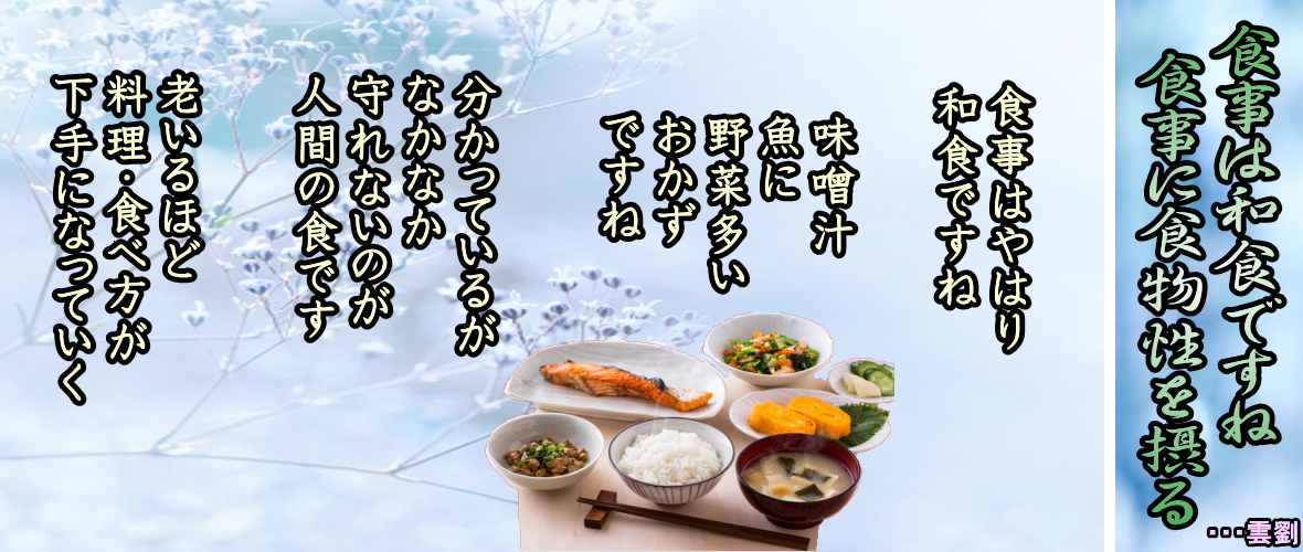 ◆14、食育・食活・食欲・食健 ・・・釜池豊秋著「食べても太らない!糖質ゼロの健康法」より ◆動物には「食いだめ」する力が備わっている 朝食抜きでは心配だとお思いかもしれませんが、大丈夫です。動物は食べたものを体内で消化・吸収し、生きるために利用します。そのおもな用途は、体を構成・機能するための細胞・生理活性物質をつくりなおすことと、エネルギーを補給することです。わたしたちの体には、もともとエネルギーを貯蔵する能力が備わっています。 いわゆる「食いだめ」ができるのです。ライオンを思い起こしてみてください。彼らは人間と同じく食物連鎖の最上階に位置する存在です。おもな獲物はシマウマなどの草食動物ですが、ふだんは彼らを見かけてもほとんど興味を示しません。 狩りを行なうのは空腹を感じたときだけです。食事は2〜3日に一度ということも珍しくありません。狩りをしないあいだ、彼らは絶食をしていることになります。人間のように手軽なおやつなどありませんから、もちろん間食もしません。しかし、それでもライオンは貧血になったり、低血糖でフラフラになったりしませんね。 もし野生の世界でそんなことが起こったら、あっという間に他の動物に襲われてしまいます。彼らが長期間の絶食に耐えられるのは、食べたものから得たエネルギーを体内に蓄えることができるからなのです。 ◆食事は和食ですね 食事に植物性を摂る