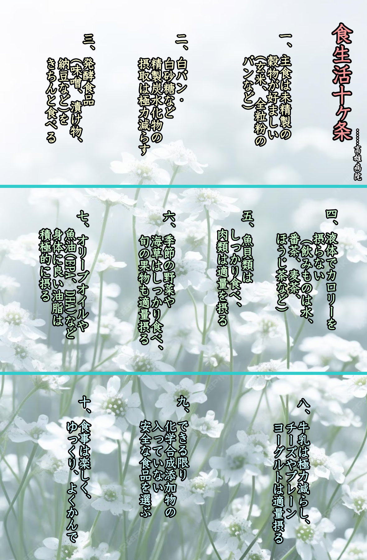 ◆21、食育・食活・食欲・食健 ・・・枡野俊明[禅、シンプル生活のすすめ] ◆食事では、一口ごとに箸を置く 「感謝の気持ち」を味わってみる *禅の修行とは、坐禅を組むことだけではない 修行僧である雲水の食事は、基本的には精進料理です。朝食(小食)は粥と香の物。昼食(点心)はご飯に一汁、漬物。そして夕食(薬石)は一汁一菜です。ご飯だけはお代わりできますが、肉類は一切食べません。禅の食事の心得として、「五観の備」というものがあります。 一つには、多くの人を思い感謝していただく 二つには、自分の行ないを反省し静かにいただく 三つには、好き嫌いせず欲張らず味わっていただく 四つには、健康な体と心を保つために良薬としていただく 五つには、円満な人格形成のため合掌していただく わかりやすく言えば、こういうことです。常にこの五つのことを思い、食事をいただけることに感謝し、一口ごとに箸を置く。なぜそうするかといえば、一口食べるごとに感謝の気持ちをもって味わうためです。食事は、ただ空腹を満たす行為ではない。大切な修行の時間なのです。 ・・・中村丁次著「疲労・肥満・病気をらくらく解消、体を守る低カロリーの食事」より ◆食の欧米化がもたらした肥満の増加 □世界一の長寿国が抱える食の問題 日本人が世界一の長寿を誇っている要因のひとつは、豊かな食にあります。肉食が当たり前になることで、良質なたんばく質をとれるようになり、肺結核など感染症に対する抵抗力が飛躍的に高まりました。一方で、日本人の食生活を取り巻く状況には、多くの問題があります。ひとつが、BSE(牛海綿状脳症)、残留農薬、水質や土壌の汚染などの「食の安全性」に関する問題です。これらの危険から食の安全をどう守るかが大きな課題です。 □豊かな食生活が健康を害する もうひとつの問題が、食生活が大きな原因となっている糖尿病や高血圧などの生活習慣病の増加です。ここ幼年の間に食の欧米化が急速に進みました。日本人の寿命を延ばしてきた食生活が、病気を引き起こし始めています。生活習慣病の原因のひとつが「肥満」です。肥満の成人が30歳代から急激に増えているのです。30〜60歳代の男性と60歳代の女性のほぼ3人に1人は、BMI(体格指数、44頁)が25以上の肥満者であることがわかっています。いつでもどこでも、好きな物が食べられる豊かになりすぎた食生活が、肥満を招き、その結果として健康を脅かしているのです。 ◆食生活十ケ条