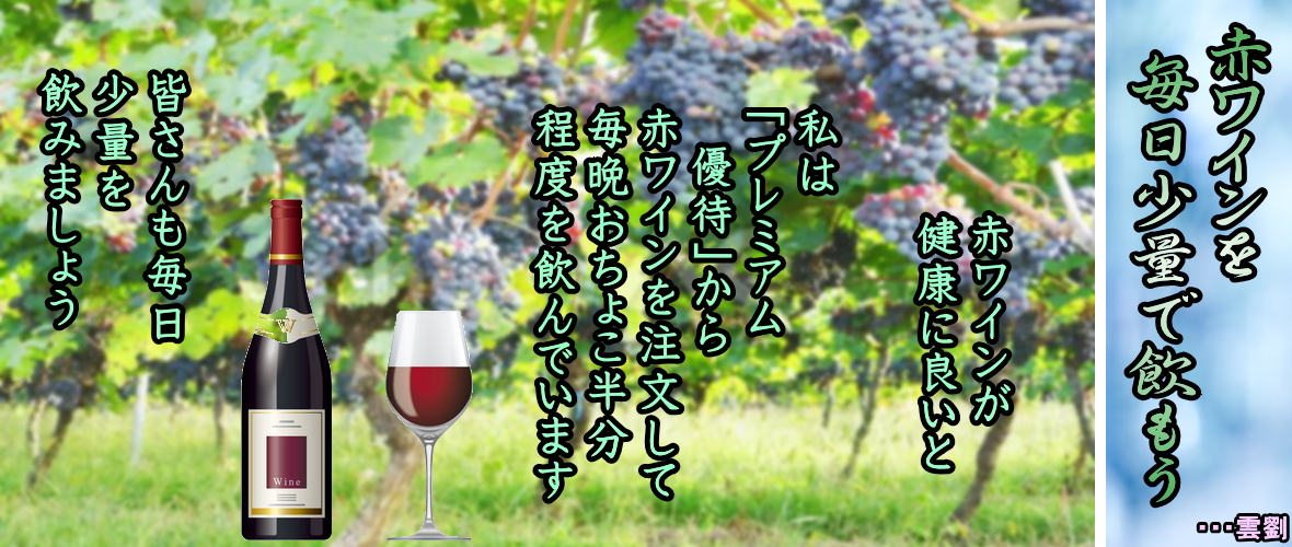 ・・・藤田紘一郎著「腸が寿命を決めている」より ◆2、グルメをフランス人に動脈硬化が少ないのはなぜ? 赤ワインのポリフェノールが活性酸素を除去 ポリフェノールは全ての植物がもつ色素成分や苦味、渋味の成分で、カテキンやアントシアニン、イソフラボン、タンニン、ルチンなどがあります。植物は毎日、紫外線にさらされていますが、この紫外線によって発生する活性酸素の影響から自分を守るために、独自にポリフェノールを発達させました。そのため、強い抗酸化作用が認められています。 赤ワインは、大量のブドウを皮ごと発酵させてできています。ブドウにはカテキンやアントシアニン、タンニンなどのポリフェノールが豊富です。タンニンといえば緑茶がよく知られていますが、ポリフェノールは特に皮と種に豊富に含まれていることから、ブドウを丸ごと使う赤ワインの含有量は、他の飲み物に比べ群を抜いています。 この豊富なポリフェノールが、その抗酸化作用を発揮して、私たちの体から活性酸素を除去してくれることが期待できます。もう一つ、ポリフェノールとして、ブドウの種に含まれている「オリゴメリック・プロアントシアニジン (OPC)」という成分があります。 OPCも抗酸化作用が強く、体内への吸収率が高く、血管を保護したり、毛細血管を強くする働きや、血液をサラサラにする働きなどが報告されています。すでにヨーロッパでは、40年以上前から医療用に応用されている成分です。 このような健康にいいポリフェノールを豊富に含んだ赤ワインですが、アルコール飲料なので、赤ワインは健康にいいからと、がぶ飲みするのはよくありません。やはりここでも、「過ぎたるは及ぼざるがごとLL で、飲酒量としては1日に2杯までにしておきましょう。また、日本人のアルコールの分解酵素は、欧米人に比べ少ないといわれています。 さらに、中には分解酵素がなく、アルコールが飲めない体質の人もいます。そのため、健康にいいからといって、フランス人のようなワインの飲み方をしていては、かえって体に害を及ぼすことのほうが多いので、注意してください。 ◆プレミアム優待倶楽部から注文した赤ワイン