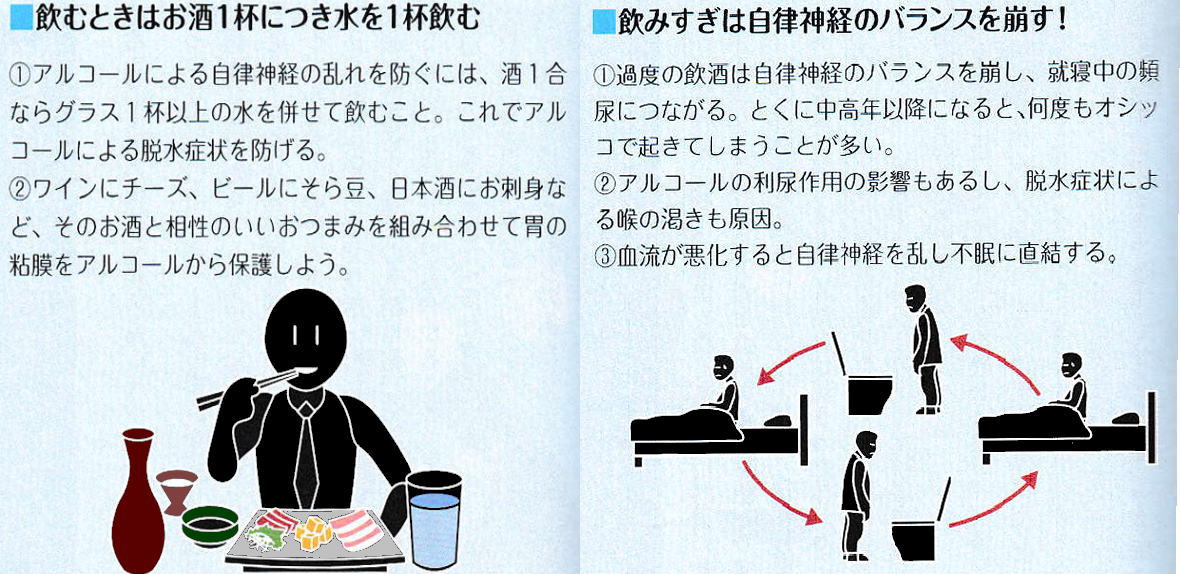・・・山本隆著「美味しいとなぜ食べ過ぎるのか、味と体の不思議な関係」より ◆禁酒・禁煙のきっかけ いったんやみつきになったお酒やタバコは、そう簡単にやめられるものではありません。幾度となく、禁酒、禁煙を繰り返し、自分は意を決すればいつでも酒やタバコをやめられることがわかった、と開きなおった屁理屈をこねて、抜け出せない人を何人も知っています。私の個人的経験からいえば、やみつきから抜け出すには、なんらかの身にしみるきっかけが必要なように思えます。 学生時代から続いていた喫煙をやめたのは、一九八二年八月二十日に、愛煙家であった父が肺ガンで亡くなった翌日からで、そのあと、タバコとはいっさい縁を切りました。アルコールについては、もともとビールのミニ缶一本で酔うほどの体質でしたが、年とともにだんだん耐性ができてきて、入浴後のビールが楽しみで帰宅するのではないか、と思えるほどになってしまいました。 やがて、ビールにかぎらず、日本酒、焼酎、ワイン、ウィスキーなどを、当たり前のように口にするようになっていったというわけです。案の定、ここ数年来の人間ドックの検査で、痛風の原因となる尿酸の値が基準値を若干オーバーし、酒を慎むようにいわれるようになりました。しかし、症状が出ないことをいいことに、酒の誘惑から抜け出せません。 ところが、つい最近、あるちょっとしたことがきっかけで、アルコール摂取に意欲を感じにくくなったのです。じっは、私は甲状腺が少し悪く、定期検診のため三カ月に一回、血液検査を受けているのですが、いつも尿酸値の高いことを指摘されていました。つい先日の定期検診では、たまたま新しい女性医師が担当となり、尿酸値が高いのを見て、「アルコールはどれくらい飲みますか?」と訊いてきました。 「はい、一日缶ビール一本です」と答えると、即座に、にこりともせず、「二日に一本にしたらどうですか」といわれました。ピールがいかにおいしいかを知らないであろう、この比較的若い女性医師から、酒なんか毎日飲むものではないよ、と平然といわれ、酒から抜け出せない哀れな人と思われたのではないかと考えると、途端にわびしくなってしまいました。 自分がみじめになって、酒なんかに負けないぞという気持ちになって、それ以後、家でのビールを二日に一回どころか、飲む気がしなくなってしまったのです。これまでの男性医師のように、ニヤッとしながら、「お酒はやめられませんよね。 しかし、酒量を少し減らしたらどうでしょうか?」などと、同じ穴のムジナと思える人からいわれても、決してやめようという気持ちにはならなかったでしょう。この、冷静というか、「お酒のどこがおいしいの、あなたダメですね」という雰囲気の、女性医師のひと言に感謝しなくてはなりませんね。 ・・・「自律神経にいいこと」、監修・青山由美子、編著・赤池広行18 ◆「寝酒は熟睡の大敵」と肝に銘じる ■すくなくとも就寝(しゅうしん)の 4時間前に4時間前には晩酌を終えること 「寝る前に1杯やると気持ち良く眠れる」と錯覚しがちだ。確かに適量のお酒は緊張をほぐすが、寝酒した翌朝は意外と「頭はスッキリ」とはいかない。酒の分量にもよるが、安眠を求めるなら「寝酒は熟睡の大敵」と肝に銘じるべきだろう。 過度の飲酒は自律神経のバランスを崩し、就寝中の頻尿につながる。とくに中高年以降になると、何度もオシッコで起こされる。これはアルコールの利尿作用の影響もあるし、脱水症状による喉の渇きも原因。またアルコールによって筋肉が弛緩(しかん)して気道が狭くなり、呼吸がうまくできなくなることもある。 睡眠時無呼吸症候群を引き起こして血管に負担がかかり、高血圧や心臓病のリスクを高めることになる。アルコールは飲んでから3時間ほど経つとアセトアルデヒドという毒素に分解される。お酒は眠るためではなく嗜(たしな)む程度に飲み、少なくとも就寝の4時間前には晩酌を終えていることが理想だ。 飲みたいときは、お酒1杯に対してコップー杯以上の水を飲む。これでアルコールによる脱水を防げる。また水を飲むことで二日酔いの症状を半減させ、消化器の麻痺も防げる。副交感神経の働きが低下すると、腸の機能が麻痺することがあるが、水を飲むことで胃結腸反射を誘発し麻痺を防げる。