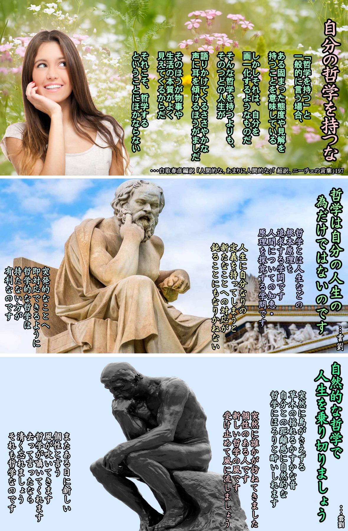 それはたぶん、彼らの現在が充実していないことが原因であろう。現在が充実していなければ、人はそれ以外の時間に逃げ込むしかない。しかし、現在に生き、それを充実させていれば、どのような忌まわしい過去であっても「そんなこともあったね」で済むようになる。現在がよくなれば、不安な未来であっても「そのときはそのときさ」という考えになれるのだ。過去にどんなことがあろうが、未来がいかに不安に満ちていようが、いっも「いま」を生きていることを手放してはならない。