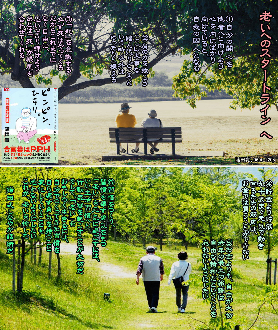 ◆老後を脅かす最大の敵は病気である 健康への投資はノーリスク・ハイリターン ・・・保坂隆[50代からの「楽しい老後」の準備をはじめなさい] 老後の最大の資産は「健康」 50歳を過ぎたら定期的に健康チェックに心がける ・・・鎌田實[いいかげんがいい] ◆頭はやわらかなのが、いい ・・・バーナード・ショー ◆年をとったから遊ばなくなるのではない、遊ばなくなるから年をとるのだ ・・・ハーブ・エッカー、本田健・訳解説[お金を引き寄せる「富裕の法則]---詳しくは本を読もう ◆金持ちになれる人は、恐怖に負けず「行動する」 お金に緑のない人は、恐怖で「何もできなくなる」 不快ゾーン″をかいくぐるから成長できる 「役に立つ考え方」を取り入れるパワー思考" |