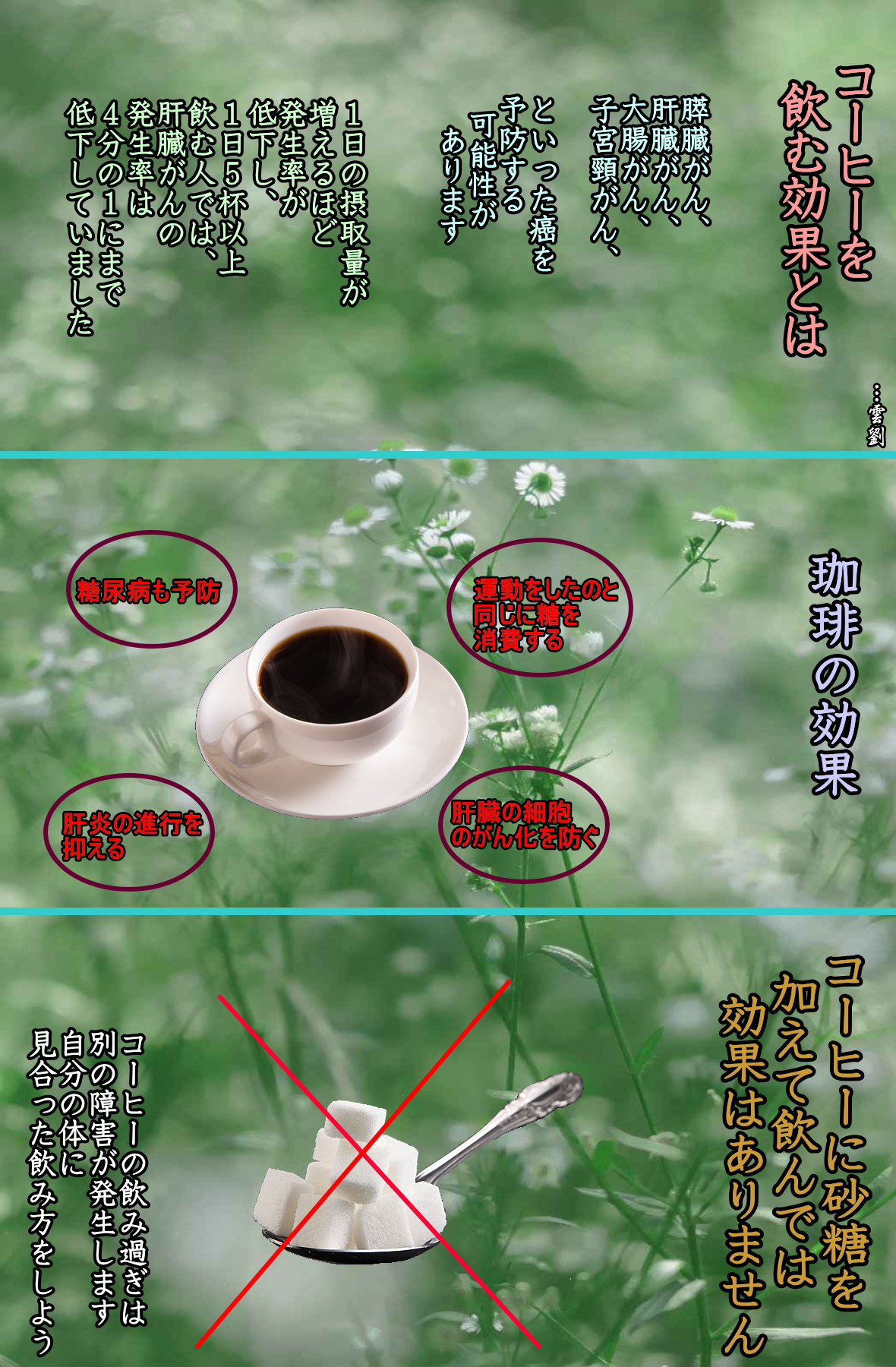 ・・・中川恵一著「最強最高のがん知識」より・・・詳しくは本を読みましょう ◆冷蔵庫がなかった世代は胃癌(がん)に注意 日本人の場合「感染症によるがん」 は、タバコに次ぐ第2位の発がん因子です。胃がんは塩分の高い食事やピロリ菌が原因に挙げられます。冷蔵庫が普及して、塩漬けをする必要もなくなり、新鮮で清潔を食べ物を食べるようになってからは減少し始めています。 ピロリ菌の感染率は20歳以下では2割程度ですが、冷蔵庫がなかった時代を経験している50歳以上では7〜8割にのぼります。また、肝臓がんの約8割はB型・C型肝炎ウイルスが原因です。 1990年代に対策が講じられる以前の輸血・医療行為などにより、国内に約350万人の肝炎患者・ウイルス感染者がいると言われています。50歳以上では、こうした感染症が原因となる途上国型のがんに注意が必要です。ピロリ菌の保有は、血液検査でも分かります。 ◆ ・・・中川恵一著「最強最高のがん知識」より ◆家系より「生活習慣」です 癌(がん)にならないためには、何に気をつければよいのでしょうか?答えは、「生活習慣+がん検診の受診」 です。「随分簡単じゃないか」と思われるかもしれません。しかし、この二段構えの対策が、高額な 「最先端治療」 よりはるかに有効なのです。まずは、癌にならないことが大事。癌にならなければ、癌で死にません。当たり前のことです。 先に述べた通り、遺伝するがん(家族性のがん)は、がん全体の5%程度です。「がん家系」という言葉がありますが、家系より「生活習慣」 のほうがはるかに影響を与えます。たとえば、一卵性双生児はまったく同じDNAを持っていますが、2人が同じがんになる確率は10%程度にすぎません。なぜなら 「生活習慣」 が異なるからです。 がんを防ぐための生活習慣として、一番大切なことは、ズバリ「タバコを吸わない」ことです。タバコの煙には数十種類の発がん性物質が含まれていて、これがDNAに結合し、細胞のコピーミスを起こしやすくするのです。タバコがなくなれば、日本人のがん死亡の約25%(男性では約40%、女性では約5%)が消滅します。 特に煙が直接触れる部位への影響は大きく、日本人男性の喉頭がんの96%、肺がんの72%、食道がんの48%が、タバコが原因と考えられています。このほか、タバコは、膵臓がん、肝臓がん、胃がんにも悪影響を与えます。タバコを吸うことは、爆心地から半径1キロ以内で被曝するのと同じくらい、癌になる危険を高めるのです。 ・・・中川恵一著「最強最高のがん知識」より ◆癌に対して注目すべきコーヒーの効果とは 前項では、お茶と癌の関係をいくつか挙げました。しかし、お茶の守備範囲ではない癌もあります。そんながんに対しては、コーヒーが効果を示すようです。コーヒーは、膵臓癌、肝臓癌、大腸癌、子宮体癌、といったがんを予防する可能性があります。たとえば、男性の場合、コーヒーを1日3杯以上飲む人は、膵臓がんにかかるリスクが4割も下がるというデータもあります。 肝臓がんでは、もっと顕著な効果が報告されており、コーヒーをほぼ毎日飲む人では、男女とも肝臓がんのリスクが約半分に減少しています。特に、1日の摂取量が増えるほど発生率が低下し、1日5杯以上飲む人では、肝臓がんの発生率は4分の1にまで低下していました。 コーヒー大国ブラジルのサンパウロに住む日系一世の肝臓がんによる死亡率は日本国内の半分以下です。肝臓がんの9割以上は、B型かC型のウイルス性肝炎が原因で発症します。コーヒーには炎症をやわらげる作用があるため、肝炎の進行を抑えることで、肝臓がんを予防するのではないかと考えられます。 また、コーヒーに含まれるクロログン酸などの抗酸化物質?が、肝臓の細胞のがん化を防いでくれるとの報告もあります。さらに、コーヒーは、膵臓がん、肝臓がんの他、子宮体がんや大腸がんなど、糖尿病や肥満、運動不足がリスク要因となる癌(がん)を予防することも分かっています。 コーヒーを飲むと、運動したのと同様に糖の消費が進みますから、血糖値を下げる「インシュリン」を分泌する必要がなくなります。一方、インシュリンは、糖尿病や運動不足が原因となるがんを増殖させる傾向がありますから、コーヒーは、がん予防にも糖尿病の予防にも役立つことになります。 厚生労働省の研究班のまとめでも、コーヒーは、肝臓がんを”ほぼ確実に〃予防し、大腸がんを予防する可能性あり?と位置づけられています(国際的には、コーヒーの有効性については、まだ"証拠不十分"と評価されてお。、日本人におけるより一層のがん予防メカニズムの解明が望まれます)。 ◆珈琲を飲む効果とは!?
