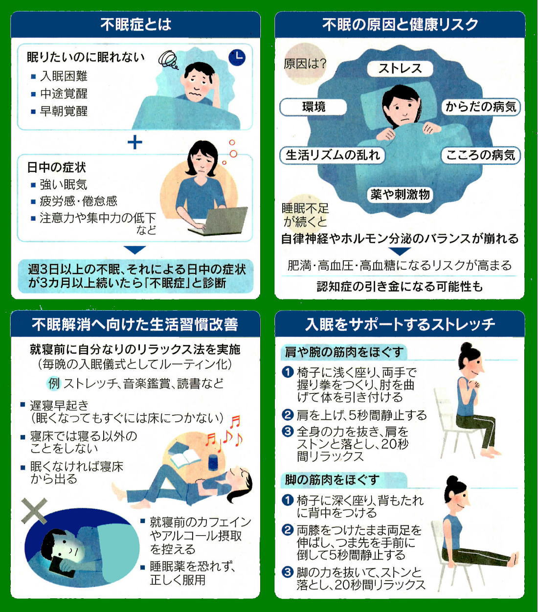 「加齢とともに必要な睡眠時間は短くなり、65歳以上であれば合計6時間寝られれば十分。寝床に入る時間、出る時間を見直してほしい」(松井センター長)また寝床でスマートフォンを見たり、本を読んだりしないこと。眠れなければ寝床から出て、眠くなるまでリビングなどで過す。寝床は眠るだけの場所と意識付けするのが不眠対策には有効だ。