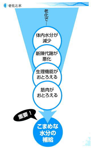 筋肉の組織はつねに多くの水分を必要としているので、年をとって各機能が低下してくれば、筋肉が落ちていくのは避けられないことなのです。のどがかわいたら飲む……、そんなライフスタイルから、「水をこまめに補給して体内をみずみずしくする」 スタイルへ、今からレッツゴー!