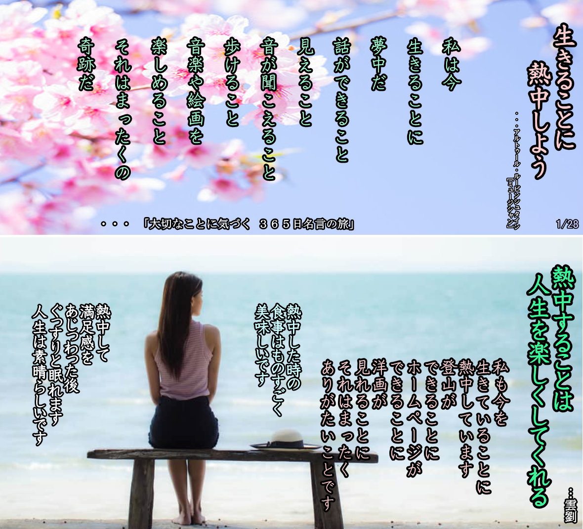 そして、感動というものは苦難ばかりが感動ではなく、喜ぶことも感動。楽しむことも感動なのです。だから、大いに喜びましょう。人をも喜ばせるほどに、たくさん喜びましょう。そして存分に楽しみましょう。喜び、楽しまなければ、せっかく生まれてきた意味がありません。根底では人生を喜び、楽しむということを忘れてはいけないのです。人生の中のすべての出来事が大切な思い出。あなたの永遠の思い出なのですから。この思い出という宝は、誰からも盗まれることもなければ、奪われることもありません。あなただけの本当の財産なのです。