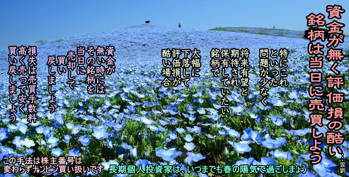何しろ一九八七年の暴落前に東京電力を八四九〇円で買っているのである。しかも、それを買うために大日本製薬(現・大日本住友製薬)を三〇〇〇円で売った。その買値は五九〇〇円だ。この話をすると、たいていの人はあきれる。しかし、まだその先があるのだ。大日本製薬を買った金は住友金属鉱山を損ギリしたもので、どえらい損が既に出ているのである。住友鉱山をなぜ損ギリしたかというと、鉱脈を掘っているうちに温泉が出てきたという騒ぎでどんどん下ったためだったが、何たることか、売った後で状況が好転して住金はうなぎ登り。