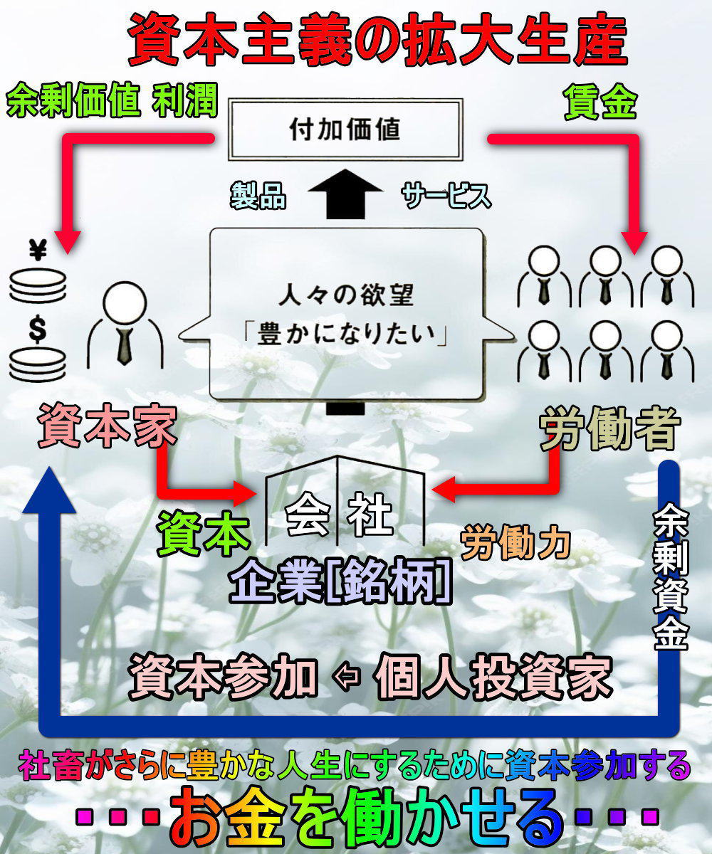 ・・・水瀬ケンイチ著「お金は寝かせて増やしなさい」より ◆グルグル回って自己増殖する「資本」 それでは、なぜ、世界各国の株式が右肩上がりに上昇してきたのでしょうか。それは、これらの国々を支える資本主義経済が拡大再生産し続ける仕組みだからだと考えられます。資本主義とは「労働力を商品化し、剰余労働を剰余価値とすることによって資本の自己増殖を目指し、資本蓄積を最上位におく社会システム」(ブリタニカ国際大百科事典)のこと。言葉で見てもよくわからないので、図解してみました(下記の図)。 まず、お金を持っている資本家が、企業に投資します(企業を所有することと同義)。労働者は労働力を企業に提供します。企業は市場で求められる付加価値が高い製品やサービスを生産します。企業はそれを売って得た利潤から労働者に賃金を払い、残った利潤を資本家に配当(もしくは株価の上昇)という形で還元します。資本家はさらに儲けるために資本を企業に投じ、労働者もさらに賃金をもらうため労働して、こうしてグルゲル回っているうちに、資本が自己増殖していく。 その過程で株価も上がっていく。こういう仕組みが資本主義経済です。これがまた、人々の 「豊かになりたい」 という欲望に見事に合致しているものだから、資本主義経済は拡大再生産し続けているというわけです。人々の欲望には限りがありません。目的地へ早く移動したいという欲望が、自動車を生み出し、一度自動車を手に入れた人は、もう、飛脚や馬車には戻れません。安全や快適性などさらによいものを求めます。 家事を楽にしたいという欲望が、洗濯機やロボット掃除機を生み出し、手に入れた人は、もう洗濯板や掃除機には戻れません。ガス湯沸し風呂を手に入れたら、薪で沸かす五右衛門風呂には戻れません。もっと豊かに、もっと快適に、人々は満足することなく、よりよい製品やサービスを求めます。日本では、景気が悪くなると、「清貧の思想」 「足るを知る」 といった、今あるもので生きようというような思想が一時的に流行することはありますが、いずれ「節約疲れ」 といって人々はまたよりよい製品・サービスを求め始めます。 また、日本にいると 「少子高齢化」「人口減少」 という単語を耳にタコができるほど聞かされますが、地球全体で見ると、人口減少というのは一部の先進国だけの事情で、地球上の人口はどんどん増えています。資本主義経済の拡大再生産は止まりょうがありません。