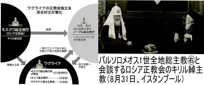 2018-09-22・・・日経より引用 ◆ウクライナ教会独立争う 非ロシア総主教が承認言及 プーチン氏、勢力圏死守へ 【モスクワ=古川英治】キリスト教東方正教会でウクライナの教会の独立をめぐる対立が激しくなっている。歴史的な中心地であるコンスタンティノープル総主教庁が独立承認に動くなか、ウクライナの管轄権を主張するロシア正教会がコンスタンティノープルに報復措置を発表した。親欧米に転じたウクライナを勢力圏に取り戻そうとロシアは政教一体で動いており、欧米との対立はとけない。 コンスタンティノープル総主教庁のエマニュエル大主教はイスタンブールで日本経済新聞の取材に応じ「パルソロメオス1世全地総主教が4月に独立承認を決めた」と明言した。「分裂に苦しんでいるウクライナの教会を一つにしなければならない」 「ロシアの圧力は受け入れない」などとも強調した。ロシア正教会は14日、コンスタンティノープルが主催‘共催する会議への出席や共同礼拝を停止する報復措置を発表した。これに先立ち独立承認を決定事項として、その事続きを進めていたことが明らかになった。ウクライナの正教会はロシア正教会傘下の教会や、世界の教会から承認されていないキエフ総主教庁などに分裂。 ロシアのプーチン政権の侵攻を受けてウクライナではロシア正教会離れがすすみ、ロシア正教会系の一部を含む各教会の主教がコンスタンティノープルに独立承認を求める請願書に署名していた。ウクライナの教会の独立承認の動きにロシア正教会は危機感を強める。ロシア正教会のイランリオン大主教は取材に応じ、1054年のカトリック教会と東方正教会の分裂を引き合いに「新たな教会の大分裂」に発展しかねないと警告した。スラブ・正教文化の発祥の地であるウクライナを失えば、プーチン政権にとって大きな打撃となる。強権支配を固めながら欧米の価値観の浸透を防ぎ、求心力を保つためにロシア正教会を後押ししてきたからだ。 ロシア正教会はプーチン氏の統治を「神の奇跡」、ウクライナの親欧米政権を「邪悪」と呼ぶなどプーチン政権と一体となって動いてきた。ウクライナなどを「勢力圏」として正当化する時に使う「ロシア世界」という概念は正教に基づく。ロシア正教会傘下の小教区の3割強はウクライナにあるとされ、仮にウクライナの教会が独立すれば東方正教会の最大勢力という地位を失う可能性もある。ローマ法王を最高指導者とするカトリックとは異なり、正教会は各国の総主教を対等な立場とする一方、コンスタンティノープル全地総主教は「同格者の中の第一人者」と位置づけられている。 歴史的にロシア正教会を含む各国の教会の独立はすべて全地総主教が承認している。これに対しロシアはここ数年、コンスタンティノープルの権威を揺さぶってきた。ロシア正教会のキリル総主教が2016年、ローマ法王フランシスコと会談し、ロシアは「歴史的会談」とはやした。同年にパルソロメオス1世が開いた1200年ぶりともいわれる東方正教会トップの「全正教会会議」はボイコットした。背景には影響力を拡大するために東方正教会の事実上の「盟主」の座をねらうプーチン政権の思惑が見え隠れする。ウクライナの教会の独立の成否はプーチン政権の野望を左右する。