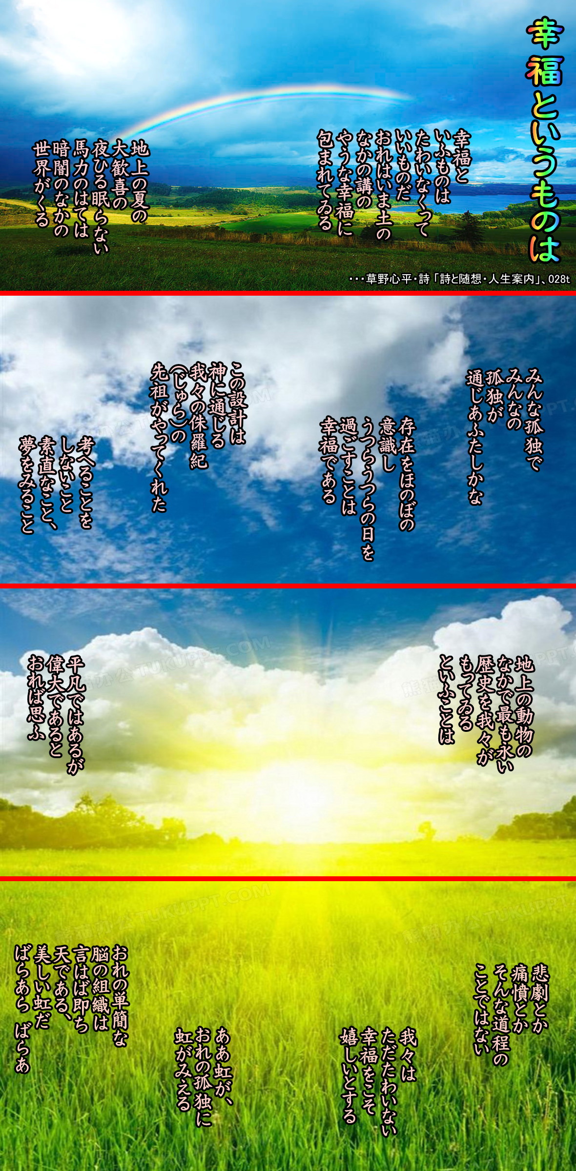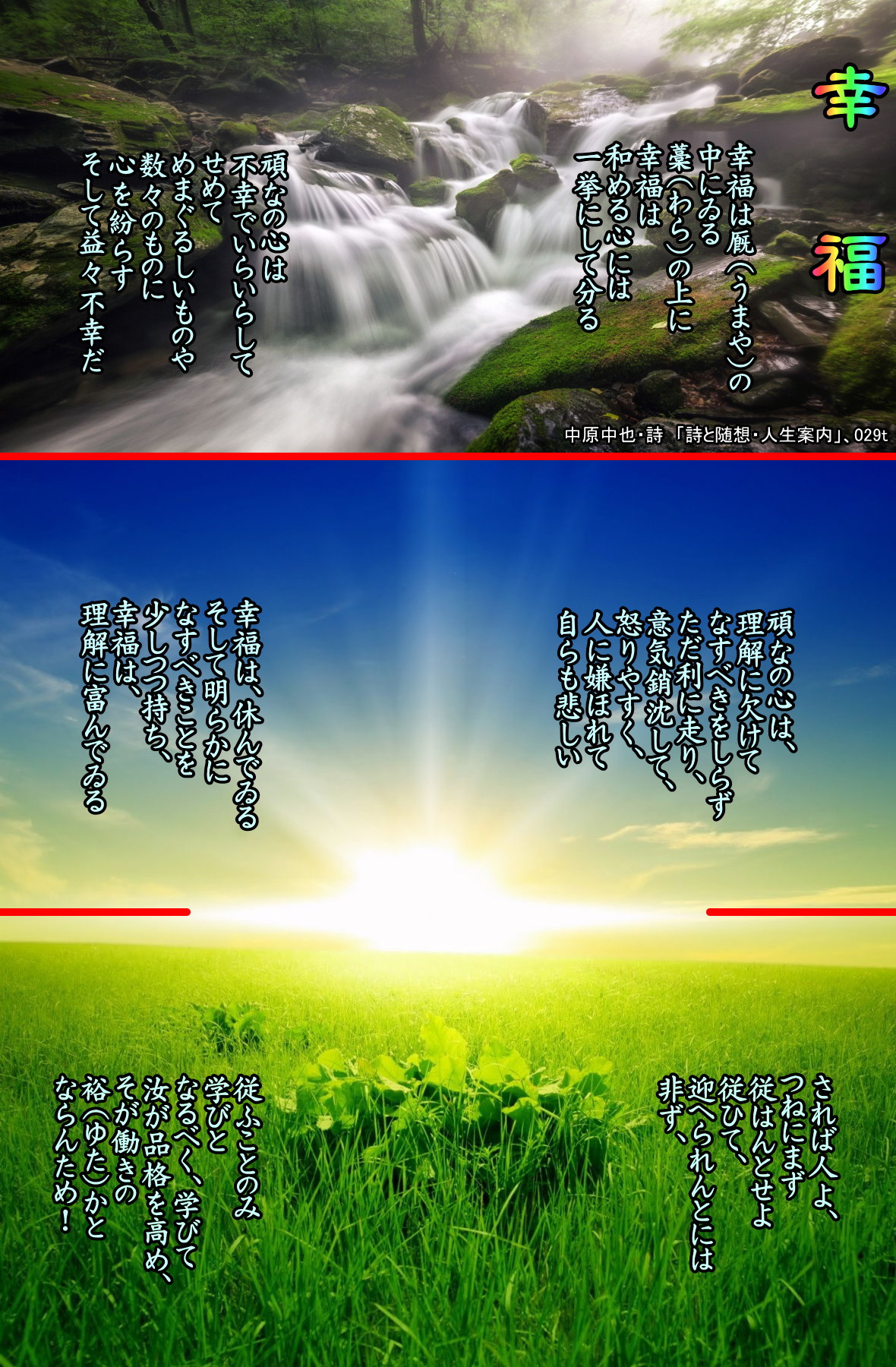 修養訓が詩句の形を借りているといったふうでもあり、むずかしいことはなにもいっていない。終連の 「されば人よ、つねにまず従はんとせよ。」は、誤解されやすいかもしれない。従うのは、おべっかを使って、人によく思われるためのものではない。「従ふことのみ学ぶ」ということは、自分のなすべきことをよくなせ、という意味でもあろう。ランボーの「幸福」は、見つけ得た幸福への没入が表わされている。「幸福がわたしの生をひきうけた」と。このように自分を預けられるような幸福を、私たちがつかむことは不可能だろうが、一日一日を着実に生きれば、そこにさりげなく幸福は現われるだろう。
