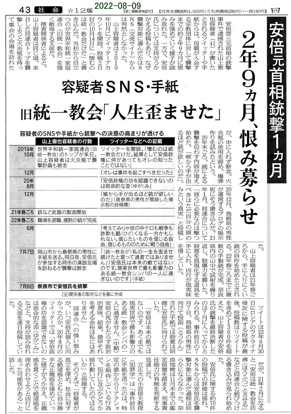 今回の事件によって「安倍統一教団体」が政治と宗教と金がつるんでいるのが暴露され世界中から大問題化して話題になっているのである。これは、絶対に許されるべきことではない、元安倍首相にあの世から帰って来て「説明責任」をしてもらいたいものである。国民の税金を使って深刻な問題のある元安倍首相の国葬をやろうとしているのも困りものだヽ(#`Д´#)ノ。これから まだまだ、元安倍首相との統一教会との絡み・信者勧誘問題・信者の扱い・家庭崩壊・政治と統一教会との癒着しているような実態が、どんどん出てくるかな・・・・・