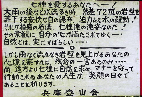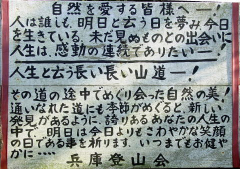 しかし、現実に見て、私達は誰もが生身の人間であり、感情の動物である以上、長所も短所もあるものだ。ただその欠点を発見した時、人間として素直に反省の努力をするか、しないかによって、その人間性に再評価を加える事が出来るであろう。パーテイーが人間関係である以上、道徳、礼儀など、社会人としてのマナー及び、山のルールも守らなければならない。兵庫登山会は、1975年1月、神戸で作られた私達の小さな登山会です。