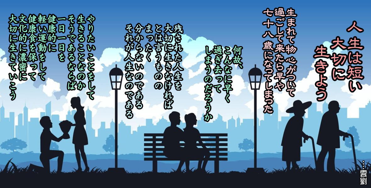 私たちは臨終のとき、自分が生き生きと輝いていたころの生命の記憶を懐かしく思い出しながら死のうではありませんか。そのためにも、まだ生命ある今という時間を、せいぜい大切に、しかも一生懸命生き続けなければならないのだろう。 |