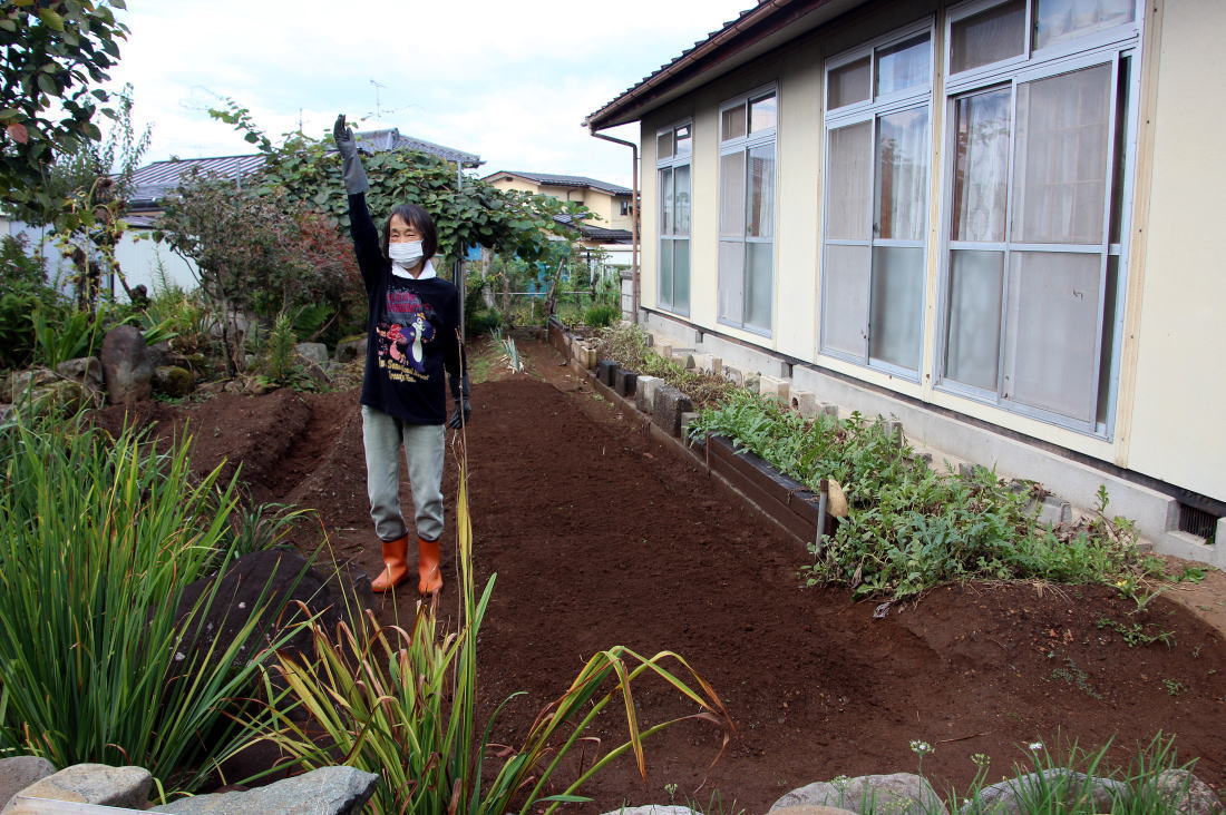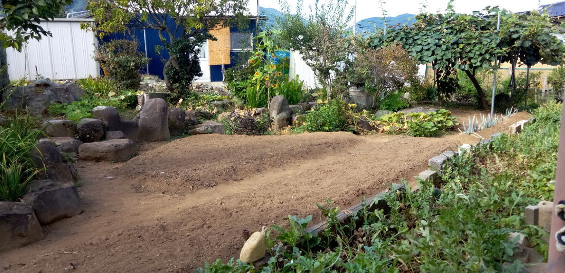 家庭菜園畑 中央奥は梅の木 右奥はキューイフルーツ棚