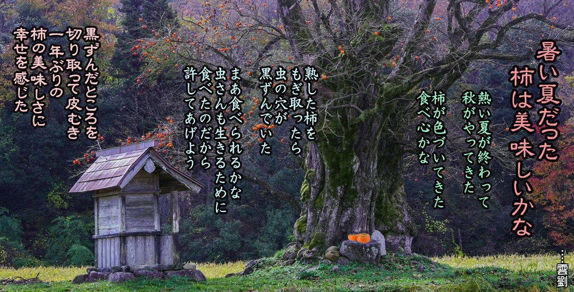 秋の気配である。大気は清澄。空が青い。その青い空に、柿の木が腕を伸ばす。枝を伸ばす。そして小枝の先で、柿の実があざやかに色づいていく。こどもがそれを欲しがる。樹にのぼって及び腰。竿をやたらとふりまわす。だがそうたやすくはもぎとれない。柿の実は、小枝の先にしっかりつながっている。その小枝は中枝に、中枝は大枚に、またその大枝は、幾星霜の年輪をきざむ樹の幹に、がっしりとくいこんでいる。