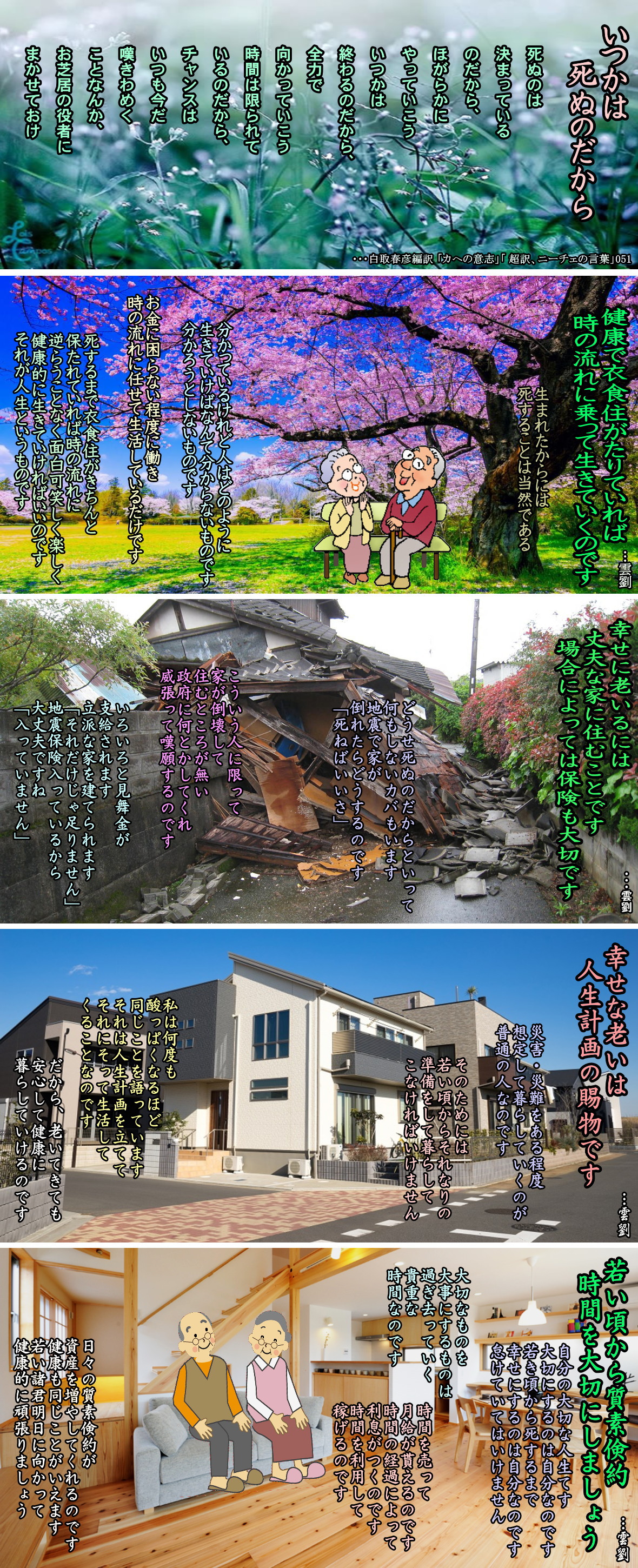 ◆ボケを前提に幸せな長生きを目指しましょう ・・・和田秀樹「自分が高齢になるということ」028p 「認知症になってまで長生きしたくない」という人がいます。みっともないとか、家族に迷惑をかける、生きていても楽しいことなんかないだろうと考えるからでしょう。でも現実には違います。わたし自身、たくさんの認知症の高齢者と向き合ってきましたが、「こういうボケはいいなあ」とか、「幸せそうなおじいちゃん (おばあちゃん)だなあ」と思うことはよくありました。 家族の人たちもゆったりしていて、まるで子どもをあやすように話しかけたり、楽しそうに昔話に興じているケースも珍しくありませんでした。そういう様子を見ていると、ボケてもいいから長生きしたほうが幸せな人生だなとつくづく思ってしまいます。もちろん、嫌な話もたくさんあります。現実にいま、認知症の親の介護で苦労している人もいるはずです。そういう人にしてみれば、「わたしはボケたくない」と考えるのは当然だと思います。 でも、ボケたくないといくら願っても、これだけ超高齢社会になってしまうと自分も含めてボケはありふれた老後の姿になります。ボケないにこしたことはありませんが、確率が2分の1ならそうなる前提で生きるしかありません。女性の場合、90歳まで生きることが当たり前のようになってきましたが、そうなると6割の方がボケてしまうのです。だとすると、幸せなボケ、ボケてもいいから幸せな老人を目指したほうが、ゆったりした気持ちで生きられるし、それによって長生きもできるはずです。 わたしは晩年が幸せならその人は幸せな人生だったと考えています。これも高齢者のさまざまな臨床例に接して得た答えですが、逆に若いときにどんなに成功しても、あるいは大勢の人に取り囲まれ持ち上げられても、老いてだれも寄りつかず、家族からも避けられて孤独になってしまう老人の人生を幸せとは思えません。ボケも同じではないでしょうか。ボケても愛される人、ボケて疎んじられる人では、晩年になっての幸福感はまったく違います。それまでがどういう人生だったとしても、愛されるボケのほうが幸せなのは言うまでもありません。