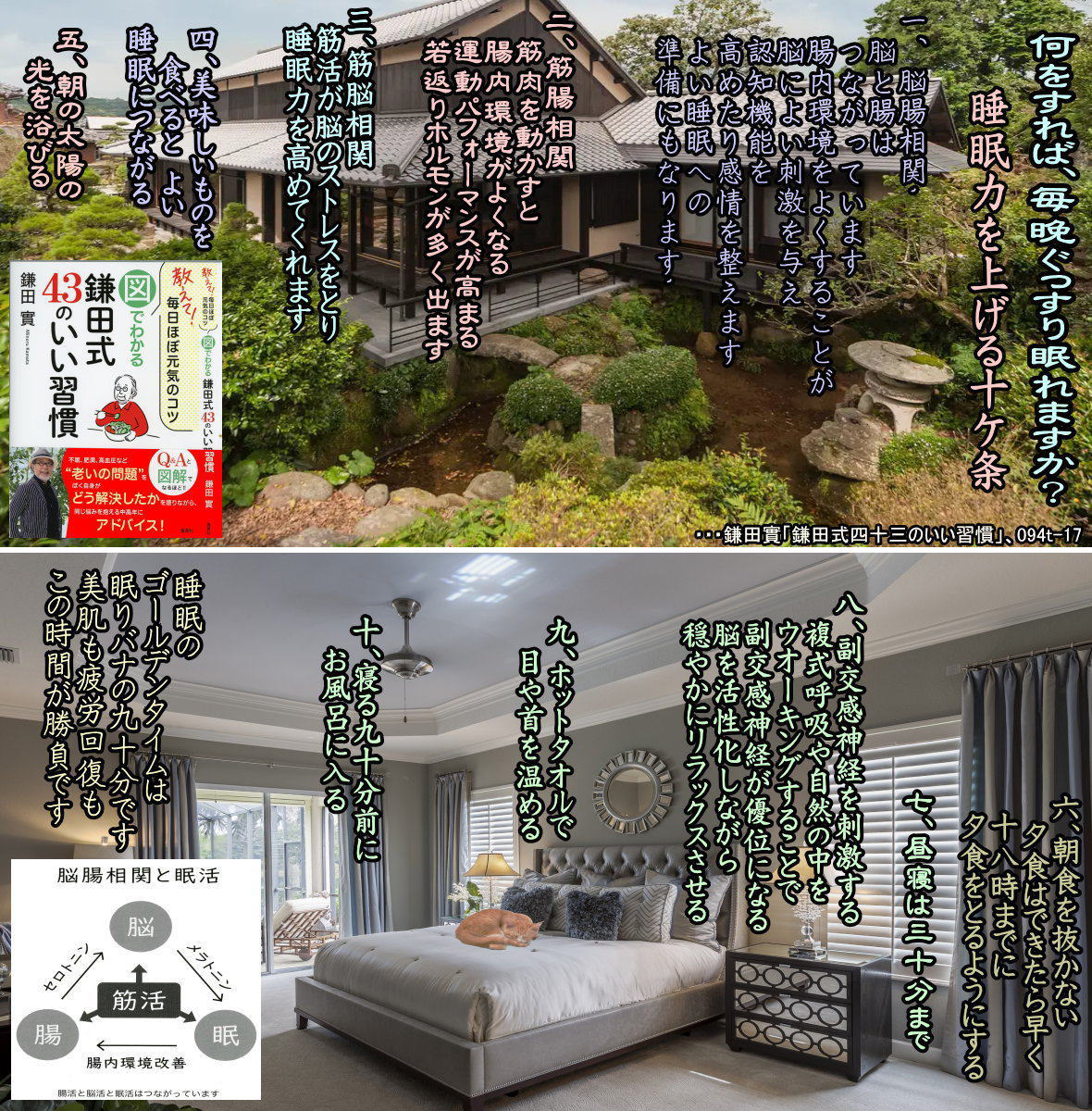◆分かっていることと分からないこと ・・・和田秀樹「自分が高齢になるということ」020p 「自分が歳をとったと感じるのはどんなときですか」こういった質問にはたぶん、ほとんどの人が肉体的な衰えを挙げると思います。疲れが取れにくくなったとか、無理がきかなくなったといったことです。意欲や気力の衰えを挙げる人もいますが、これもやはり、以前のような行動力とかエネルギーがなく狂ったことと関係してきます。「このまま歳を重ねていけばどうなるんだろう」ということも、なんとなく想像がつきます。 「いまよりもっと、足腰が弱ったり、身体全体が弱ってくるんだろうな」ということです。そこで、そういった肉体的な衰えを食い止めるために、ウオーキングを始めたりジムに通ったり、あるいは日常生活の中に少しでも身体を動かすことを取り入れるようにします。実際、80代になっても90代になっても、背筋がシャンとして足取りもしっかりとしている高齢者は珍しくありません。肉体的な衰えは、ある程度、意識的に遅らせることができるのです。では、頭脳の衰えはどうでしょうか?これが分からないのです。 「人やものの名前が出てこないとか、何を買いに来たのか忘れてしまうとか、そういうもの忘れはたしかに増えてきたかな」そう感じるときはあります。これだって 「歳のせいかな」と思います。でもそういう状態が、これからさらに高齢になっていくとどう変わってくるのか、そこまでは分かりません。身体的な衰えのように、意識すれば食い止めることができるのかどうか、それも分かりません。つまり、自分がこれからさらに高齢になっていくということの中には、予測できることとできないことがあるのです。 ◆何をすれば、毎晩ぐっすり眠れますか?睡眠力を上げる十ケ条