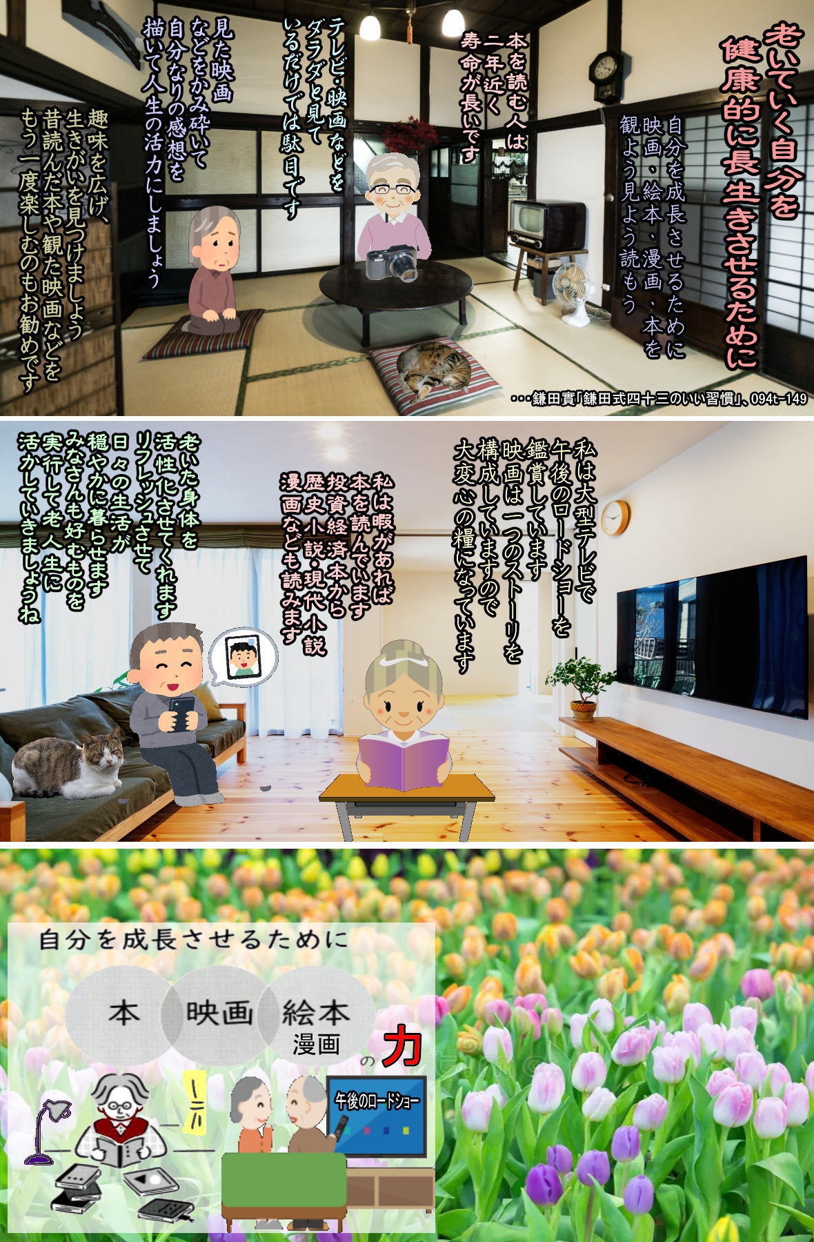本を読むことは想像力や読解力を働かせます。集中力や記憶力なども大いに働かせます。もちろん認知症予防にもなります。好きな本を探すために図書館に通うことは運動になるし、人との交流が生まれることもあります。シニアにこそおすすめの健康法なんです。読書とは、心と体の健康を底上げしてくれるもの。1日30分でかまいません。興味があるジャンルの本をまずは手に取ってみましょう。絵本でもいいですよ。食事術に加えて、ぜひ読書も習慣にしてみてください。