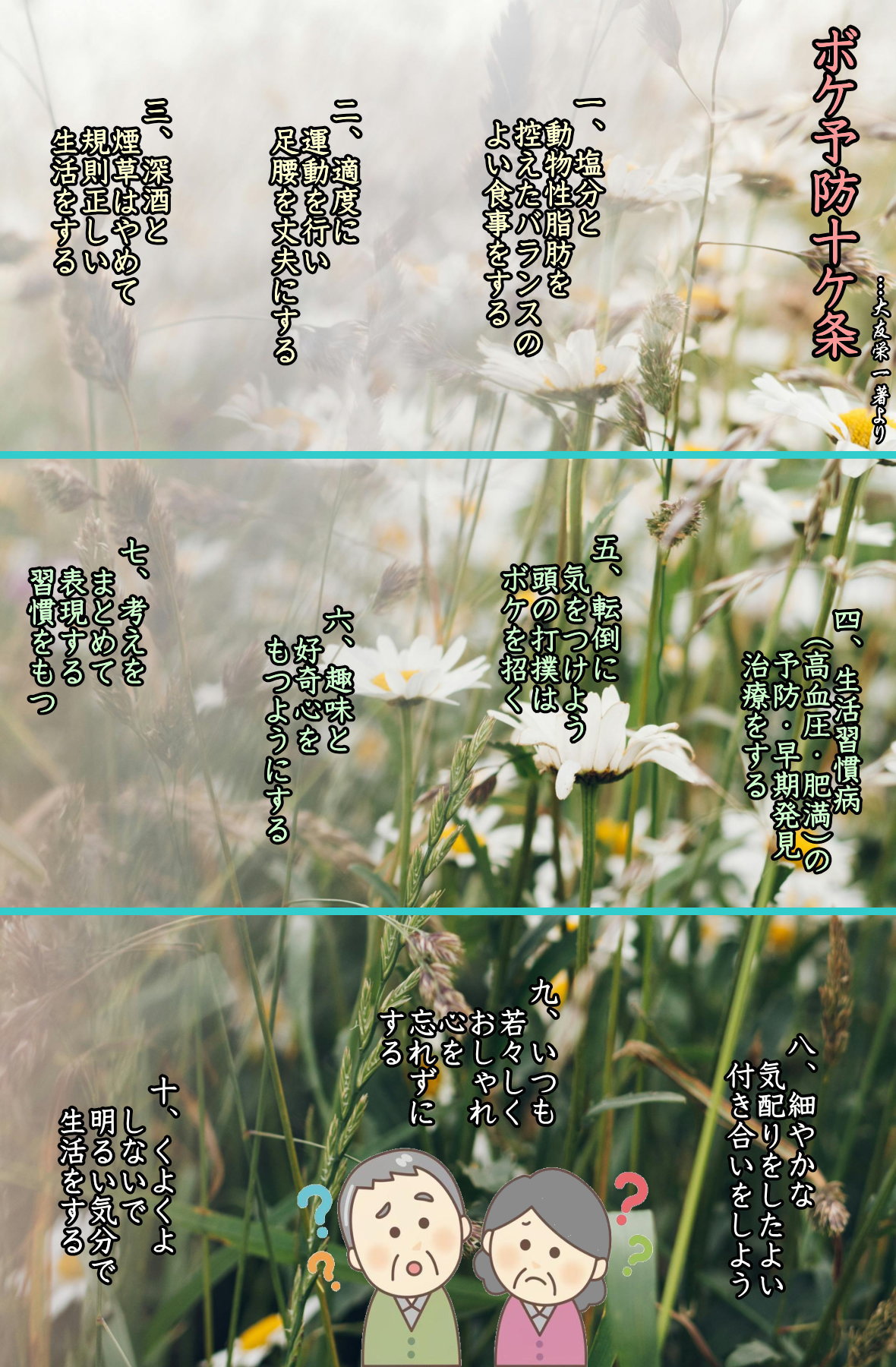 ・・・和田秀樹「自分が高齢になるということ」98 自分らしい暮らし、自分に合った生き方が大切 たまたま旅行の話をしましたが、出かけるのは嫌いで本を読むのが好き、映画を観ているときがいちばん楽しいというのでしたら、それでちっとも構いません。「閉じこもってばかりいると早くボケる」という人もいますが、要はその人にとって楽しいこと、幸せな時間を大切にすればいいのです。もちろん人と会って話すことは脳にも刺激を与えます。でもそれは、本人が会話を楽しんでいるときです。「刺激になるんだから」と言い聞かせて、気が向かないのにムリに人と会って話しても苦痛な時間しか生まれません。 脳には逆にストレスを与えてしまうでしょう。こういったことは、認知症であろうがなかろうが、年齢を重ねてきたらだれにでも大切な暮らし方になってきます。自分にとっての楽しさや幸福感を生み出すものを最優先させる暮らし方こそ、うつの予防になってきますし、仮に認知症になったとしても進行を遅らせることにもなってくるのです。あくまで医学的な見方をすれば、そもそもアルツハイマー型の認知症というのはゆっくりとしか進まないと言われています。老いとは本来、そういうものですね。 でも、老化に伴う脳の萎縮以外の要因が、認知症の進行を早めてしまうことがあります。それがここまでにも説明してきた「あきらめ」や不安、焦燥感などですが、加えて過去には認知症を世間に恥ずかしい病気として家族が隠してしまう傾向がありました。家の中に閉じ込めてしまうのですから、楽しいはずもないし幸せな気持ちにもなれません。そういう時代には、いまよりもっと症状の進行も早かっだはずです。つまり家族や周りの人の接し方が認知症の進行を早めてしまうことがあるのですが、このテーマは残りの章で取り上げてみましょう。 いまの時代は、かつてと比べると認知症に対する理解が格段に進んでいますし、認知症の人も自分から発言したり、家族以外の人との交流を持つようになり、そのための施設や場所も増えています。もう昔のイメージは払拭されてきているのです。そういう時代に、自分らしい暮らしや自分に合った生き方を選ぶというのは、何の遠慮も要りません。好きなことをして幸せならそれでいいし、人と会って話したくなったらそれでいいでしょう。いちばん自然な暮らし方が、いちばん自然な老い方を導いてくれるはずです。 ・・・森田香子「60歳から食事を変えなさい」35 ◆夜中にトイレで起きることが増えた… 膀胱の若さを保つ食事は血管も守る? 50歳を過ぎた頃から気になりはじめるのが、トイレに行く回数の増加。以前は夜中にトイレに起きることもまれたったのに、今では2回以上起きるようになってしまった - という人は少なくないのではないでしょうか。夜中に1度起きるくらいなら気にならないかもしれませんが、できることなら若い頃のようにトイレに行かずにぐっすり眠りたいと思う人は多いでしょう。 トイレが近くなるのは、膀胱の老化が原因かもしれません。膀胱の血管が老化してくると膀胱に弾力、がなくなるため、おしっこがためられなくなってくるのです。年をとると抗酸化力が低下するため、その結果、一酸化窒素という成分が減ってしまい、トイレが近くなっている可能性があります。この一酸化窒素です、が、実は、全身の血管をしなやかに保ち、血流を良くするという、とても重要なはたらさをしています。 膀胱の柔軟性を保つのはもちろん、動脈硬化や生活習慣病の予防にも役立っています。また、高血圧や糖尿病、脂質異常症、動脈硬化などになってしまうと一酸化窒素が十分に作られなくなるという、悪循環にも陥ります。ですから、ある程度の年齢になったら、膀胱の柔軟性を保つためにはもちろん、動脈硬化をはじめとした生活習慣病の予防のためにも、できるだけ一酸化窒素を保つような食生活を心がけるべきです。 一酸化窒素は、アルギニンとシトルリンを原料に作られます。どちらも若さを保つために有益な成分として、健康食品の広告などで耳にしたことがあるのではないでしょうか。アルギニンはからだに必要なたんぱく質を構成するアミノ酸の一種なので、基本的にたんぱく質、が豊富な肉類やえび・まぐろといった魚介類、大豆・大豆加工品に多く含まれています。 シトルリンもアミノ酸の一種ですが、こちらは、スイカ、メロン、ウリ、かぼちゃ、ズッキーニ、きゅうり、ゴーヤーなどウリ科の果物や野菜に含まれています。これらには、ビタミンC、ビタミンE、ポリフェノール、βIカロチンなどの抗酸化物質も含まれています。少しでも老化のスピードを抑えるために、これらの食材を心に留めておいてください。 ・・・日本老年行動科学会・毒蝮三太夫・井上勝也「老人学」98 ◆年語りを狙う悪徳商港に引っかからないためには、どうすればいい? 以前、「悪徳商法に気をつけろ」っていうCMに