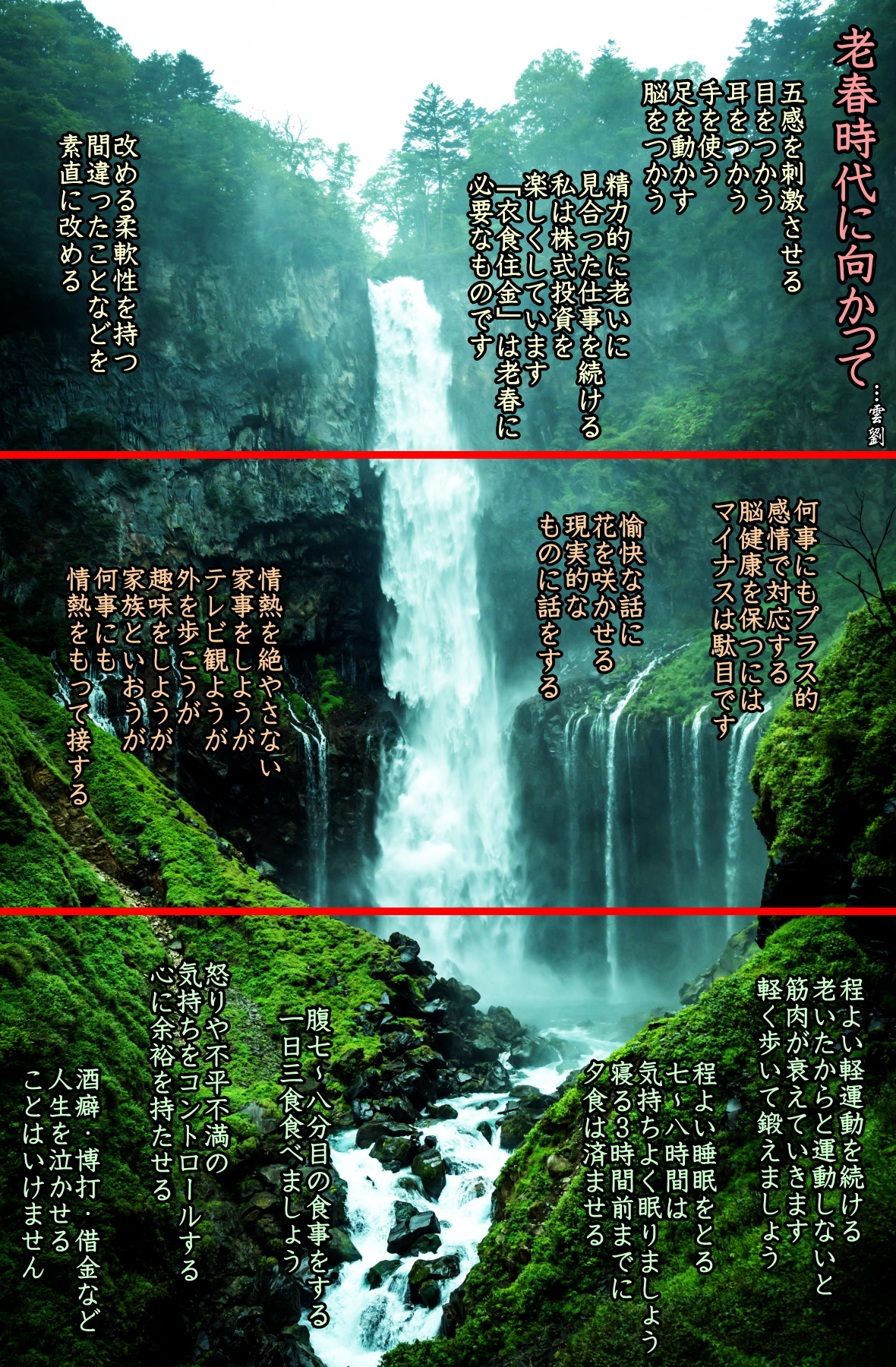 ◆31、老い、脳を鍛える ・・・齋藤茂太著「自分らしく生きて死ぬ知恵」より ◆「手段」と思えば何事も身につく 例、パソコンを楽しく習おう! 中高年になってくるとついつい発してしまうのが「面倒くさい」という言葉だ。これはいけない。ボケが早く到来する人の最も多いパターンだ。いまの四〇代後半以上のサラリーマンは、自分たちが社会人になってそろそろ中堅と呼ばれるころにパソコンや携帯電話が登場した世代である。こうした電子機器はあっという間に普及したものだから、ついていくのに必死だった覚えもあるだろう。逆に、もうおれはアナログでいくと、知らんぷりを決め込んだ人もいるかもしれない。 最近、中年を対象にしたものだけでなく、高齢者を対象にしたパソコン教室も繁盛しているのだという。定年後はたっぷり時間があるのだから、パソコンを習うのもひとつの手だろう。別に習いにいかなくとも家族で使っている人がいれば、ちょっと貸してもらって覚えることもできよう。すべての機能を使いこなそうと思うから気が重くなる。自分の興味のあるところだけ使えればそれで十分なのだ。 そもそもパソコンのすべての機能を使いこなしている人などいないのだから、その程度でいいのである。パソコンなどの電子機器は、ただの道具と思えばいいのである。最初は囲碁や将棋のゲームから徐々に使い方に慣れていけばいい。パソコンを覚えようとするのではなく、ゲームのやり方を覚えるようにするのである。そうすれば、楽しんでいるうちに自然と扱い方を覚えてしまう。料理やスポーツだってそうだ。 健康のためと思ってやるから面倒くさくなる。楽しみと思ってやれば面倒くさくもないし、上達もする。もうだから上達しなくてもしょうがないと諦めることはない。もっと楽しむ感覚が必要なだけなのだ。とにかく、「もう歳だ」といったり、思ったりするのはやめにしたい。確かにそういえばだいたいの人は大目に見てくれて無理強いはしないだろう。それに慣れきってしまい、何事も「やる」ことより「やらない」ことで納得するようになる。 反面、若者についていけない気持ちは持っているから、嫌味が口をついて出てくる。こうなると、まことにかわいげな老人になる。やってもやらなくてもどっちでもいいとなったら、できるだけやるほうを選択するというぐらいの気概でいたほうが、後半生はいきいきと生きられるものである。 ◆老春時代に向かって