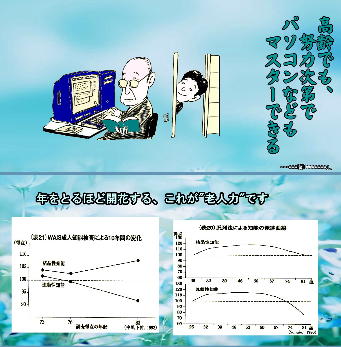 ・・・?162 ◆時間はかかるが新しい知識も取り込める 1、例、パソコンを習う! 記憶力が低下すると頭の働きが全妓的に悪くなり、つまり、知能も衰え、高齢者は、新しいことへの挑戦などは無理、と決めつけてしまう傾向もあります。これまでは、知能の成長は青年期、遅くとも成人前期までに終わり、それ以降はしだいに衰退するだけだと考えられてきました。しかし、これは異なる年齢の人を調査し、得られたデータを年代別に整理した結果であり、現在では、より多くのデータから、知能の成長のピークはもっと後の年齢にあることが明らかになってきました。 ただし、痴呆のような病的変化がある場合は除きます。健康に年を重ねた場合は、知能は全般的に落ちるわけではありません。また、一口に知能といってもいくつかの能力があり、能力によっては、年齢を重ねることにより、さらに成熟することもわかってきました。七〇歳の勇介さんは第二の勤め先も退職し、ふんだんな自由時間を手にするようになりました。 そこで、若いときから興味をもっていた考古学の勉強をしようと、都民カレッジに入るといいだしました。息子や娘もこれには大賛成。ちょうど遺跡のブームと重なり、最新の青森の縄文遺跡や山梨の縄文遺跡の実写フィルムを見ながらの授業はとても魅力的で、あっという間に三か月の受講期間は過ぎてしまったそうです。つぎに、勇介さんが入ろうとしだのはパソコン講座です。 かねがね関心はあったのですが、仕事をしていたころはパソコンを習いにいく暇がなく、必要なことは若い部下に頼んでやってもらっていました。ところが、「今度はパソコン講座に申し込んだ」と報告すると、妻は笑い出す始末。妻から子どもに話が伝わったようで、週末にやってきた息子は、「うちだって、雄太のほうがずっと上達が早かっだくらいなんだよ。パソコンは若いうちじゃなきゃグメだよ」といいます。 ・・・?162 ◆時間はかかるが新しい知識も取り込める ●2、例、パソコンを習う! 雄太とは中二の孫。娘はもっと遠慮がなく、「お父さん、パソコンを買ぅのはやめたほうがいいわよ。どうせ、途中で放り出すに決まってるんだから」と決めつけます。そんな、子どもたちの態度に出はなをくじかれたようになってしまった勇介さん。そして、じつさいにパソコンを前にすると、やはり、考古学の勉強とは大違い。キーボードだ、マウスだと使い慣れないものが多く、ファイルだとかアイコンだとか、やたらに横文字が出てくるのも苦労の種でした。 しかし、勇介さんは、ここで退いては息子や娘にバカにされたとおりの結果になると一念発起し、年金から手にしている小遣いをためたお金でパソコンを買うと、本を片手に、暇さえあればパソコンの前に座って猛練習を開始しました。勇介さんはなかなかの知恵者で、孫のパソコンと同機種を選び、わからないことは孫に電話して聞くという戦法も組み入れました。同機種なので、電話でも手にとるように教えてもらうことができたのです。 こうして、若い人の何倍もの時間はかかったものの、ついにパソコンをマスターし、デジタルカメラで撮影した画像を取り込むこともできるようになり、最近はメールで孫と通信したりしています。不思議なもので、日ごろ、顔を合わせてもあまり会話のなかった孫とも、パソコンを介した共通の話題ができ、孫にメールを送るとちゃんと返信メールを送ってくるのです。そしてついに自分のホームページを開設。 ホームページに考古学関連の情報をのせたところ、全国の縄文遺跡ファンからもメールが飛び込むようになり、楽しみの輪も広がりました。勇介さんの例のように、年をとっても新しく知識を取りこむことはちゃんとできます。最近では、インターネットを始めたお年寄りが交流する「シニアネット」も増えています。シニア・ナビは、高齢者に役立つホームページを集めたサイト。こうしたサイトがすぐに開けるよう、親のパソコンに登録しておくなど、子世代は情報収集の後方支援にまわるとよいでしょう。 ・・・?162 ◆時間はかかるが新しい知識も取り込める ●流動性知能」と「結晶性知能」とは 勇介さんの例でいえば、なぜ、考古学の場合は苦労なく引きこまれ、勉強の成果もすぐに上がったのに、パソコンは若い人の何倍も時間がかかるというように、同じ新しい知識をインプットするのにこれだけの差ができたのでしょうか。老年心理学では、知能を「結晶性知能」と「流動性知能」 の二つの側面に分けて考えるようになっています。「流動性知能」とは、新しいことを学習したり、新しい環境に適応するための問題解決能力をいい、「結晶性知能」とは、学校で受けた教育や仕事や社会生活のなかで蓄えられた経験に基づき、それを生かす知能をいいます。 これらの知能の加齢変化に関する調査はこれまでも多くの試みがなされていますが、シャイ工は、年代別調査と同一対象者の追跡調