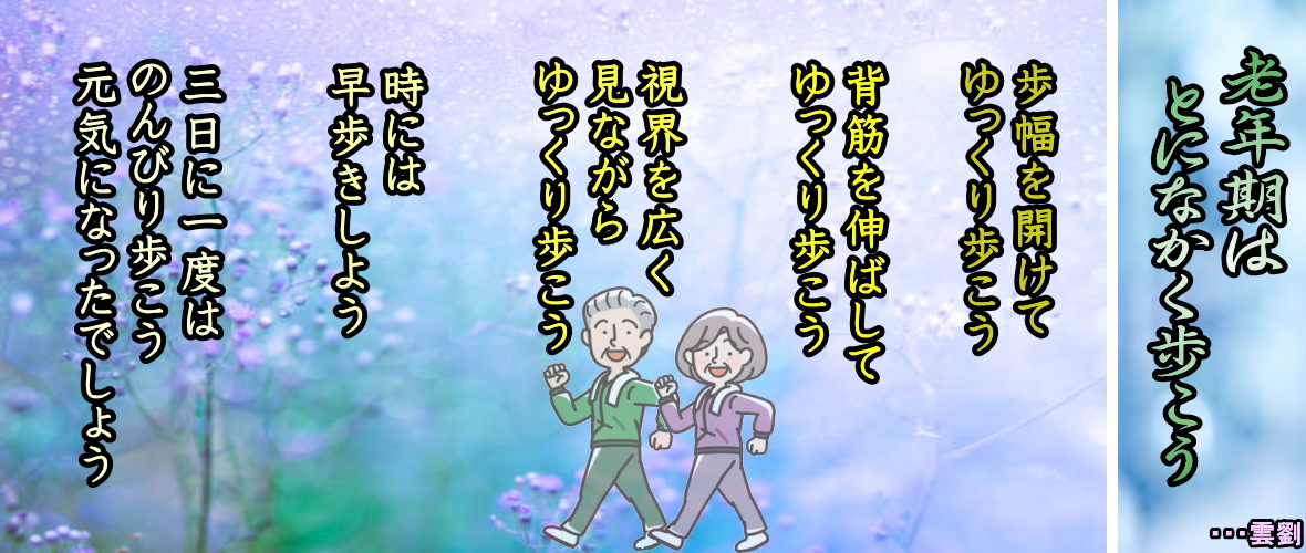 24-**-** ◆[40]老年時代、 外へ出よう 脳を刺激させよう ●6、ウオーキングで血管が若返る 糖尿病は血管をはじめ全身が老化しやすい病気です。ですから糖尿病予防・治療のための糖尿病ウォーキングは老化防止、若返りにも効果大なのです。生活習慣病を放っておくと、血管そのものとそこを流れている血液に変化が起こります。まず血管のしなやかさが失われ、だんだんと硬くなっていきます。 そして血管の内壁に余分なコレステロールがたまっていくのです。それを処理するために白血球の仲間がやってきて、コレステロールを食べてくれますが、その際にさまざまな化学物質が放出されて血管の壁を傷つけます。一方、もともと血液は流れが滞ると固まる性質があります。そうでなければ怪我をした際、血が止まらず大変なことになりますが、生活習慣病があると血液がより固まりやすくなります。 よくいわれる血液ドロドロという状態です。ズバリ、「老化は血管から」です。動脈硬化は血管の老化症状です。実際、脈波伝導速度(PWV)という検査で血管の硬さを調べてみると「実年齢が40歳でも血管年齢が70歳」という患者さんも珍しくありません。外見上の若さよりも、元気で長生きするためには血管の若さが大事です。 「カラグを若々しく保つ」ためには動脈硬化を予防し、血管をしなやかにして血液サラサラの状態をできるだけ長くキープする必要があります。それにはまず内臓脂肪を減らすことが大切です。なぜなら内臓脂肪から動脈硬化を引き起こして血液をドロドロにする因子が放出されているからです。その脂肪を減らすためにウォーキングが効果的なのです。血管の老化から自分を守るためにできることが、簡単にすぐ始められるウォーキングです。 ◆老年期は、とにかく歩こう