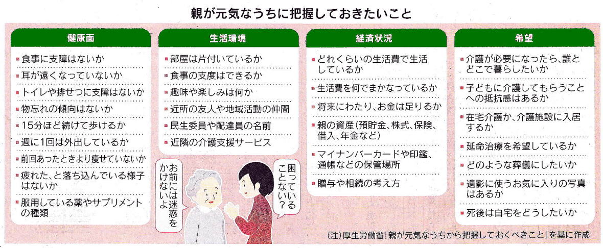 2025-12-13・・・日経より ◆帰省時に親の状況を把握 無神経な詮索は禁物 離れて暮らす親が高齢になると、心配になるのは「健康やお金」のこと。早めに問題に気づければ、子の立場から支援できることも多い。年末年始の帰省は親と顔を合わせる貴重な機会。困っていることをさりげなく探ってみよう。 少し前までは元気だった親も、年齢を重ねるにつれ健康面や生活環境、経済状況が心配になってくる。近い将来に介護が必要になれば生活にも大きな影響が出る。帰省は色々と確認できる良い機会だが、無神経にしつこく尋ねたりヽ詮索したりすると嫌がられるので注意が必要だ。まずは健康面から。歩き方や歩く速さ、腰の曲がり具合、耳の聞こえ方、物忘れの傾向、部屋の散らかり度、食事の様子など、本人に聞かなくてもわかることは、様子をよく見ればチェックできる。 服用している薬やサプリメントを一声かけてスマホで撮影しておけば、ネット検索などで健康状態がある程度推測できる。薬袋からはかかりつけ医もわかる。万が一のときのために、管轄の地域包括支援センターの所在地や連絡先、利用できる介護支援サービス、役所の高齢者福祉窓日、民生委員の名前もリスト化しておきたい。これらも親に直接聞かなくても調べればわかる。帰省時に散歩して現地を確認しておけばより安心感が増す。 直接聞かないとわからないことは、会話の途中でさりげなく聞きたい。行政書士で、高齢者支援を手掛ける一般社団法人「みんなのプライド」(東京・葛飾)を運営する尾久陽子さんは、「お年寄りに出身地や先祖の話、お寺やお墓、葬儀時の宗教を聞くと積極的に話してくれる」と教えてくれた。これらは親が元気なうちに聞いておかないと亡くなったときに困ることになる。子どもが家族のルーツを聞くことは、家を引き継ぐ意思表示にもなるので親は喜ぶだろう。 口が滑らかになったところで、親の生活パターン(1日単位、1週間単位)や生活上困っていること、不便に感じていることなどを確認したい。いざというときに親の安否を確認できるよう、伸良くしている友人の名前と連絡先も聞いておくとよい。マイナンバーカードや病院の診察券、印鑑類の保管場所なども聞いておきたい項目だ。親の経済状況や保有財産については、踏み込みにくい話題ではある。 しかし、親がお金に困った事態になると、子にも影響が及びかねない。逆に多くの財産がある場合は、相続税の対策をした方がよいかもしれない。お金のことは少しずつでも親子で共有したい情報だ。だが、尾久さんは「子どもが親のお金を胸算用し、上から目線で管理してあげるという態度は、親との信頼関係が揺らぐ。やがて、お前たちには迷惑をかけないと口論になるだろう」と注意を促す。 親のお金について、子どもが言ってはいけない禁旬がある。「お母さんのことを思って」「心配だから言っている」「お金はどれくらいあるの」「通帳を見せて」「片付けないとダメ」「さっきもその話を聞いた」などと口にすると、親の機嫌を損ね話が進まなくなりかねない。経済ジャーナリストの荻原博子さんは「整理ができていないのも、何度も同じことを言うのも、高齢者として当たり前。否定したら心を開ざしてしまう」と諭す。 そこで親の財産の在りかが自然にわかる方法として提案するのが、① 自分の過去と今を記す「自分史ノート」を渡す、② 小さめの金庫を買って実家に設置してしまう、の2案だ。自分のことをまとめるうちに資産状況も整理されることが期待できる。ただ、ノートをポンと渡してもスラスラ書くのは難しい。自身が書いたものを親に見せ「書けるところだけ書けばよい」見本とすれば、親もその気になるかもしれない。また家に金庫があれば、親がそこにまとめて通帳や土地の権利書などを保管しやすくなる。詐欺や盗難、災害が心配なら、実印と銀行印は子どもが預かっておくのも手だ。(ライター 坂本 君子)
