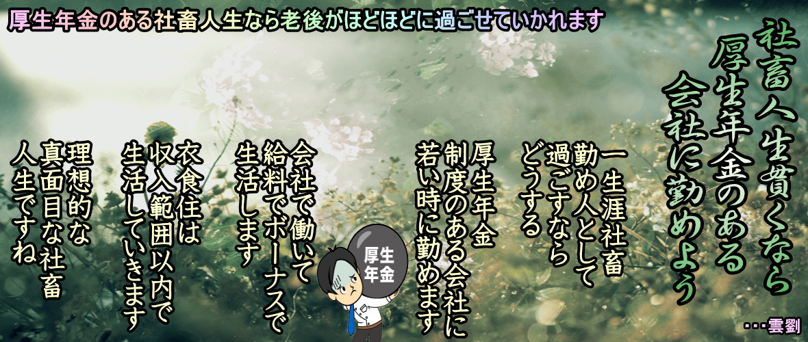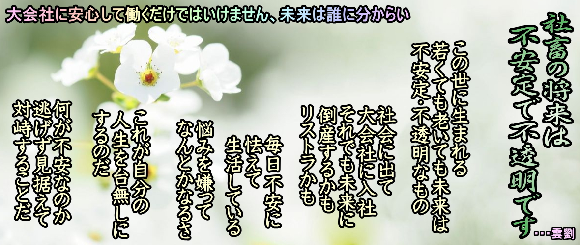 ◆社畜しながら何とかしょう 私には自営業する能力はない。自営するだけのスキルがない。無理をして自営業して失敗したら今まで貯めてきたお金がパーになってしまう。心配性の私には最初から無理と決め付けていました。というわけで最初から副業で株式投資をしようと決めていました。 投資をしよしようと思っていて宅地を買わなければ、車買わなければ、家を建てなければ、結婚しなければと、いろいろと お金のかかる問題が山積みしていて なかなか踏み切れないでいた。そんな状況の日々の中でも投資への準備に手抜きはしなかった。 そのおかげで現在に無至っている。若い人たちが社会に出る前に社畜として過ごすのか、途中から会社を経営するのか、ある程度決めて覚悟していたほうが人生への無駄が酢来なく抑えられてメリハリがあると思う。 ◆社畜の将来は不安定で不透明です