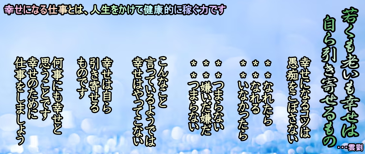 ●定年からの株式投資はどのように 私は思う、定年65歳超えてからの株式投資は控えたほうがいいと思われる。何故かというと退職金が入ったからと勉強もしてこないで株式投資をしようなんて行為は自殺行為である。まさにパチンコ感覚である。 年金だって現役時代と違ってただ生活していくだけの金額程度しか年金は支給されないのだ。老人になって儲けようと無謀な欲をかいてまで年金までつぎ込んでも家族に自分も貧困に追い込むだけである。65歳から株式投資をしようと勉強してきているなら株式投資をしましょう。 若いころは呑み込みがいいから3年ほど勉強すれば良いが、老年は5年以上勉強してから株式投資をするのがよいと思われる。なぜかというと老年になるほど脳の動きが鈍るからである。 ◆若くも老いも幸せは自ら引き寄せるもの