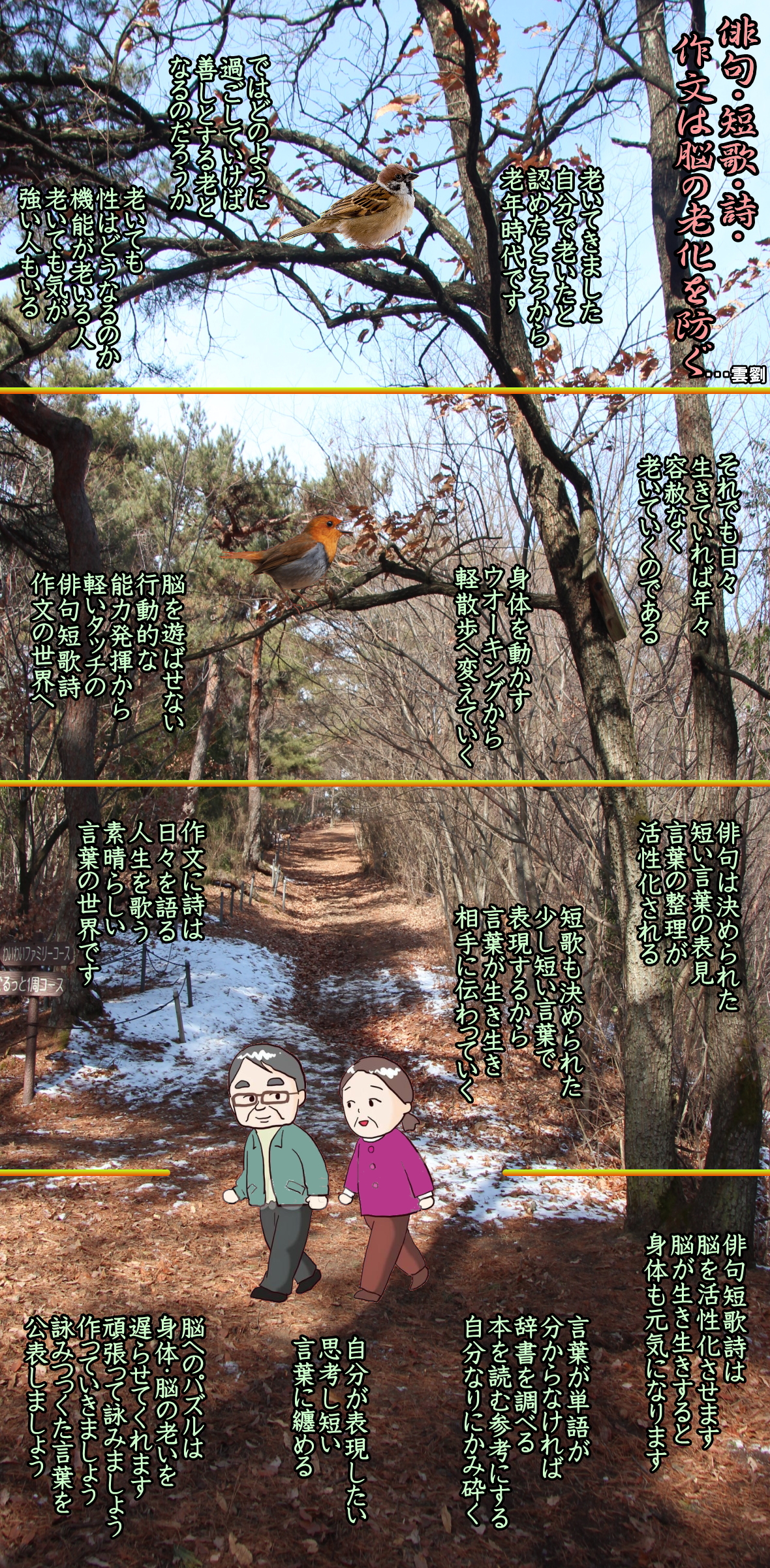・・・雲劉 ◆老人になるほど自分の欠点を 指摘されると剥きになりやすい ・・・雲劉 ◆老いて幸せに生きるには、 生活できるお金と気持ちよく寝て、 美味しく食べて、気楽に散歩して、 楽しく思考する お迎えが来るまで健康を保って清潔に呆けないで待ちましょう ◆俳句・短歌・詩・作文は脳の老化を防ぐ