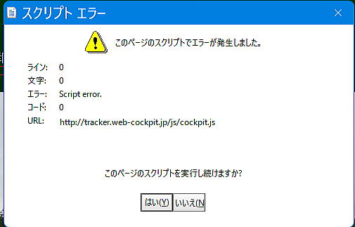 ・・・・・・・・・・・・・・・・・・・・・・・・・・・・・・・・・・・・・・・・・・・・・・・・・・・・・・・・・・・ ◆古いバージョンを「HPB22」に切り替えた 今までは一度もブロックされたことはなかっのでした。各ページサイトでブロックされるものとブロックされないものがありました。色々と調べたらホームページビルダーの古いバージョン(IBM時代のもの)を使用しいるためだと判明しました。 バージョンの新しいもの(ジャストシステム18・22)を使用したものはブロックされていません。 各ページのブロックされたサイトはホームぺシージビルダのバージョン22に修正しました。 ・・・・・・・・・・・・・・・・・・・・・・・・・・・・・・・・・・・・・・・・・・・・・・・・・・・・・・・・・・・ ◆スクリプトの削除 スクリプトエラーが原因なら、私のHPでは使用頻度が少なく不必要と思われる「スクリプト」を削除すればいいのではないのかなと思って試しに削除してみました。そしてネットでそのページサイトを観覧したらブロックされないし、これはというエラーもありませんでした。必要とするページがある場合は「HPB22」に切り替える。 それなら古いバージョンのIBM時代の「バージョン12」などの各ページの「ソース画面で「<script~~cockpit~~</script>」を削除しました。スクリプトを削除した各ページは[00]を記してあります。 *下記はHTMLソースで削除したスクリプト範囲です
