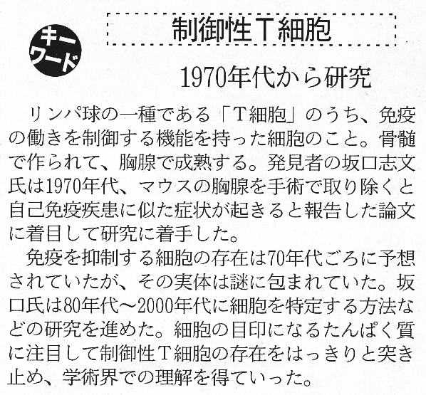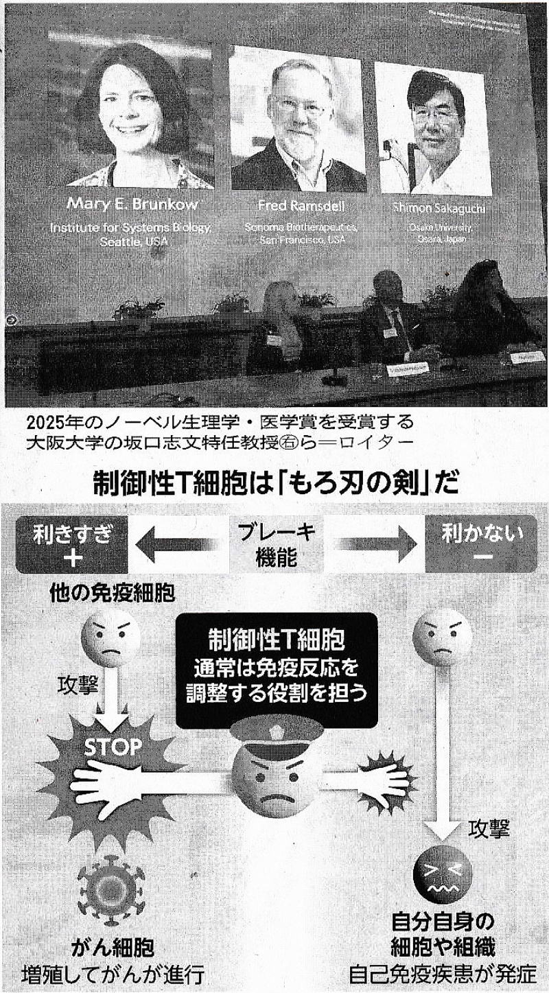 2025-10-26・・・日経より ◆ブレーキ細胞もろ刃の剣 免疫の攻撃からがん守る側面 2025年のノーベル生理学。医学賞は免疫の働きを抑える「制御性T細胞」を発見した大阪大学の坂口志文特任教授らが受賞する。実はこの細胞は体の味方にも敵にもなる「もろ刃の剣」だ。免疫の暴走を防ぐが、ブレーキが利きすぎれば、癌(がん)の進行を招く。研究を通じて細胞ががんにだまされ、免疫の攻撃から守る様子が見えてきた。癌の裏をかく治療法の開発に期待がかかる。「がん治療で制御性T細胞の応用が進むことを期待している」。 17日に日本経済新聞の取材に応じた坂口氏はこう話した。坂口氏は1 9 9 5 年に細胞を発見し、関連する研究を先導した功績でノーベル賞に選ばれた。この細胞は過剰な免疫反応を抑える。人間の体では他の免疫細胞が、がん細胞やウイルスなどを攻撃し、がんや感染症から身を守る。制御性T細胞は免疫のバランスを調節する。この細胞が十分に働かないと免疫細胞が暴走し、体の組織や臓器などを攻撃する。 それとは反対にブレーキが利きすぎると、がんを攻撃する免疫細胞の働きを抑えてしまう。その結果、がんの進行につながる。ブレーキが利きすぎるのはなぜか。免疫の仕組みに詳しい国立がん研究センタ―の西川博嘉・腫瘍免疫研究分野長は「がんが制御性T細胞を手なずけるためだ」と説明する。がんは免疫の難敵だ。正常な細胞の遺伝子が変化するとがん細胞になり、無制限に増える。通常は免疫細胞に排除されるが、がんは巧妙に多くの制御性T細胞を周囲に集める。すると免疫反応が弱まり、がんは攻撃を逃れて増殖しやすくなる。 西川氏らは癌がこの細胞を呼び寄せる仕組みを追究してきた。2020年には細胞と肺がんの関係を解明した論文を米科学誌「サイエンス・イムノロジー」に掲載した。がんが「ケモカイン」というたんぱく質をつくると、それに結合する分子を持つ細胞が周囲に集まった。同年には胃がんがこの細胞を招き寄せる仕組みに関する論文も米科学誌「イミュニティー」に掲載した。細胞の栄養源の脂肪酸をがんがつくっていた。西川氏は「ごちそうを用意されて細胞がだまされる」と説明する。 制御性T細胞はがん治療の効果を下げる恐れもある。米ダナ。ファーバーがん研究所などはがんが免疫の攻撃を避けるのに使う「PD1 1」という分子に注目した。この分子を持つ細胞が多い患者にがん免疫薬を投与すると、分子が少ない人々に比べて生存期間が約3割短かつた。免疫薬が結合した細胞のブレーキ機能が強まり、がんを免疫の攻撃から守ってぃた。24 年に論文を科学誌「クリニカル・キャンサー・リサトチ」に掲載した。 がんの治療効果を高めるためには、がんを守る細胞を取り除く必要がある。その手掛かりになる研究も進んでいる。がんの周囲に集まる細胞では「CCR8」というたんぱく質が働いている。塩野義製薬はこのたんぱく質に付いて細胞を除去する抗体医薬を開発中で、22年に第1 段階の臨床試験(治験)を始めた。同社と共同研究する大阪大学の大倉永也特任教授は「マウスでは1回の投与でがんを完全に排除できた」と効果に期待する「命に関わるがんは創薬研究が盛んで、細胞の医療応用も先行しそうだ。 この細胞の免疫を抑える機能が利きすぎると、がんの他に自血病などが発症することがある。 一部の自血病は免疫を担う細胞が異常になり、増殖を続けることで起きる。投薬などで制御性T細胞の機能を弱めれば、他の免疫細胞が自皿病細胞を攻撃して病気を治療できる可能性がある。一方でブレーキが働かないと1型糖尿病や関節リウマチといった自己免疫疾患やアレルギー疾患などにつながる。ブレトキの機能を強める技術を開発すれば、それらの病気の治療に役立つ。坂口氏は制御性T細胞の基礎研究を続ける方針だ。もろ刃の剣の細胞を安全性を保ちつつ医療に役立てるには、その働きや特徴を詳しく解き明かす必要がある。(川原聡史)