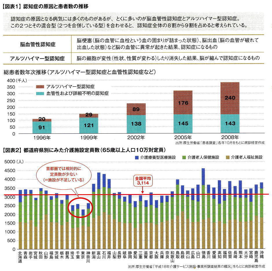 2012-01-**・・・日経マネーより引用[監修村上賢二] ●認知症が急増!長期の在宅療養の備えを 入院日数がどんどん短くなっている 家族が健康で一定の資産があり、終(つい)の棲家も決まっている場合は、親子で互いの希望や思いを話し合う“ゆとり’’が生まれるため、相続の準備もスムーズに進むでしょう。第4章では、「医療」「住まい」「資産づくり」をキーワードに、イマドキの高齢者事情を紹介します。 ◇生活習慣が認知症の引き金になる可能性も 高齢者に急増している病気として注目されているのが「認知症」です。認知症とは、単に老化に伴って物覚えが悪くなるといっただれにでも起きる現象、いわゆる「物忘れ」は含まず、通常の老化現象よりも能力が低下する脳の病気をいいます。認知症患者の中心は65歳以上の高齢者。精神科が担当する医療機関が多く、MRI(磁気共鳴画像法)による画像診断と患者本人やその家族に対する問診で症状を確定します。原因はさまざまですが、中でも多いのが脳血管性認知症とアルツハイマー型認知症です【図表1】。 脳血管性認知症は、生活習慣病である脳梗塞や脳出血が原因で認知症になったというもの。重症化する生活習慣病は高血圧や脂質異常症、糖尿病などが引き金となる事例が多く見られます。つまり、脳血管性認知症になった方は、生活習慣病が重症化するリスクが相対的に高く、悪性新生物(がん)や急性心筋梗塞を発症する可能性も相対的に高くなるといえます。認知症と診断されると記憶をはじめさまざまな障害がおこり、失った機能を取り戻すことが難しく長期の治療を余儀なくされるケースが多いです。 厚生労働省の医療施設(動態)調査・病院報告(2010年)によると、全病床の平均在院日数は32・5日。対して、認知症などを含む精神病床は1年近くにもおよびます。治療期間は長引きがちで、退院後もリハビリが必要。本人はもちろん、家族の負担も大きくなります。一方、政府や医療機関は「入院日数の短縮化」を目指していることをご存じでしょうか。先の病院報告によると、2010年の平均在院日数(一般病床)は18・2日。 1999年が27・2日だったので、10年間で約10日も短くなりました。認知症などを含む精神病床は前年に比べ6・4日短くなっています。入院日数の短縮化の背景には、「医療技術の進歩」と「国民医療費抑制の流れ」があります。政府は国民骨保険制度の維持を目的に国民医療費の抑制を目指しており、その一つの方策が診療報酬制度の改正などを通じた「入院日数の短縮化」です。医療機関の経営に直結する入院基本料の算定基準を、短期入院ほど高くなるように設計して、入院日数短縮化へ政策誘導しています。 ◇療養は「支出が増え、身入りが減る」 医療政策における入院日数の短縮化は、自宅で療養したりリハビリ通院する在宅療養期間が長くなることを意味します。同じく、介護政策においても「在宅」は大きな流れとなっています。しかも、国の財政事情を踏まえると、この傾向は今後も続くと思われます。例えば親が認知症になり自宅で介護する場合、外部の訪問介護サービスの活用が考えられます。夫婦共働きの家庭ではどちらかが休職してケアする必要もあるでしょう。支出が増え、身入りが減る。在宅療養期間が長くなれば、経済的には厳しさが増します。 介護施設を活用する方法もありますが、とくに都市部では施設数が不足しています【図表2】。自分の希望するところに入居できるとは限らないのが現実といえそうです。認知症の重症化を防ぐには、生活習慣病の予防と病気の早期発見・早期治療が原則。「かかりつけ医」を見つけて定期的にコミュニケーションを図りましょう。親が一定年齢に達したら、早めに資金の手当てや介護施設などの検討を進めておきたいですね。